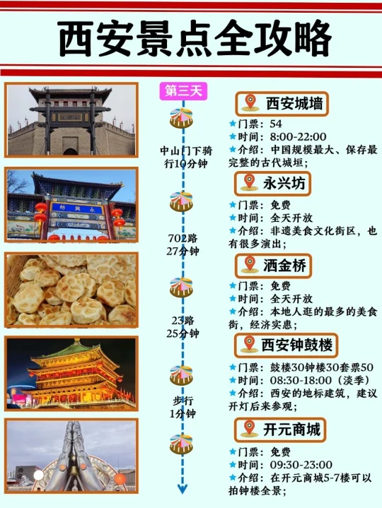 第3️⃣天:西安城墙—永兴坊—洒金桥—西安钟鼓楼—开元商城