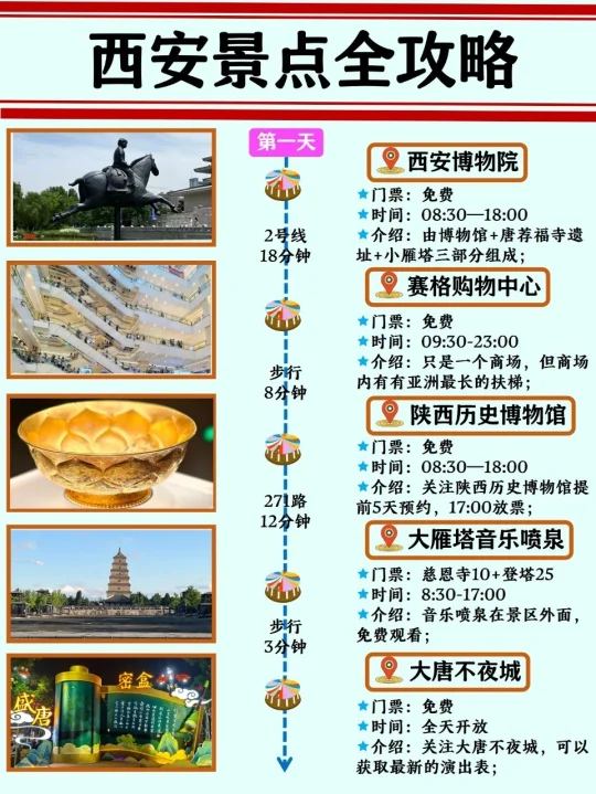 第1️⃣天:西安博物院—赛格购物中心—陕西历史博物馆—大雁塔音乐喷泉—大唐不夜城