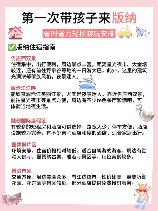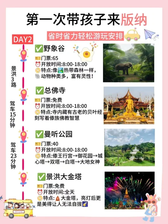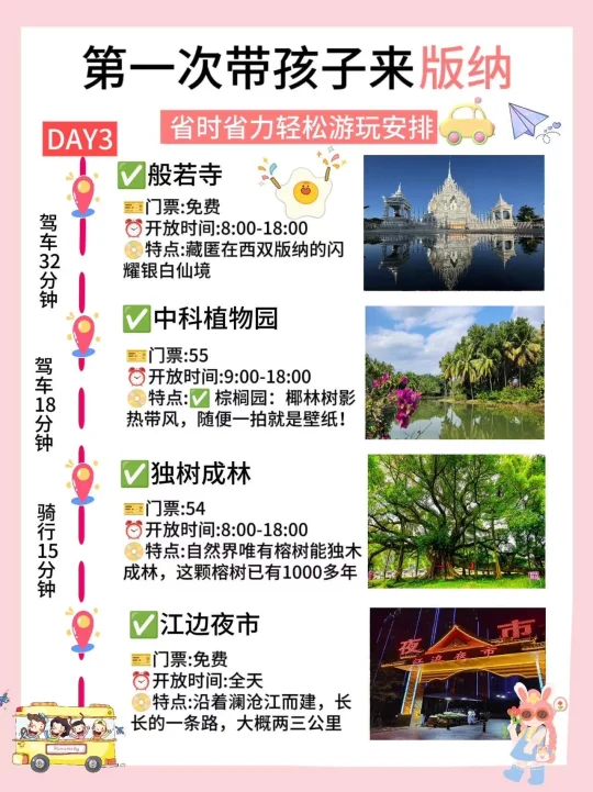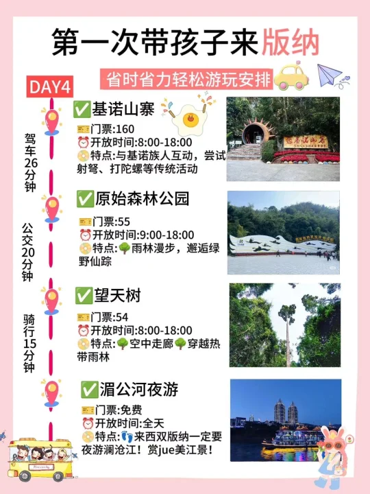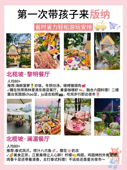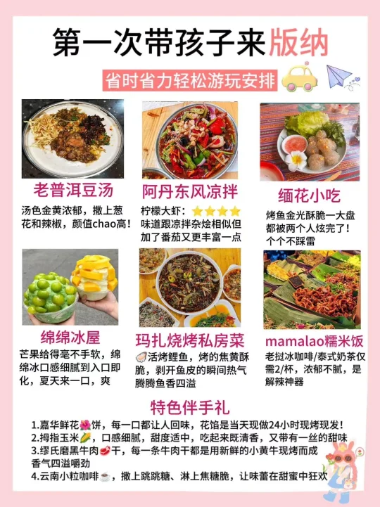 🌈版纳的4日游行程安排 ✅Day1行程:傣族园→勐泐大佛寺→告庄西双景→星光夜市 ✅Day2行程:野象谷→总佛寺→曼听公园→景洪大金塔 ✅Day3行程:般若寺→中科植物园→独树成林→江边夜市 ✅Day4行程:基诺山寨→原始森林公园→望天树→湄公河夜游 - 🔴美食安利 1⃣️北榄坡·黎明餐厅: 藏在热带雨林里的神仙东南亚餐厅,环境简直杀疯了!!点了泰皇咖喱虾🦐,融合六国料理。二楼露台也是氛围感chao足,适合拍照📸打卡,离大金塔hen近,吃完直接去夜市喽 2⃣️北榄坡·澜湄餐厅: 伴着江景看见落日🌇余晖!他们家的芒果糯米饭一jue!芒果清甜多汁,糯米饭软糯香甜,主打泰式料理哦~吃完🉑沿江散步,5分钟即到星光夜市! 3⃣️mamalao糯米饭🍚: 🈶粉干和米粉,建议大家点mini碗,初次尝试不用怕浪费哟~ 4⃣️玛扎烧烤私房菜: 凉拌虾🦐哦,新鲜活虾,口感鲜嫩爽口,还有点芥辣香🥰 5⃣️缅花小吃: 菜包鱼🐟真的棒ji了!有两种酱料:花生酱和酸辣酱! 6⃣️老普洱豆汤: 豌豆味浓厚,豆香四溢,包裹着米干入口滑嫩,一口下去,满满的幸福感! 7⃣️阿丹东风凉拌: 凉粉酸酸辣辣又滑又弹,到现在都还在回味,绿豆冰带冰碴的,夏天就爱这口啊 8⃣️绵绵冰屋: 绵绵冰🍧贼大一碗,两个人都吃不完,芒果🥭大块又新鲜‼️ ⭕特色伴手礼. 云南小粒咖啡☕,拇指玉米,嘉华鲜花饼,缪氏磨黑牛肉干(口感鲜美,原汁原味的黄牛肉🥩香)