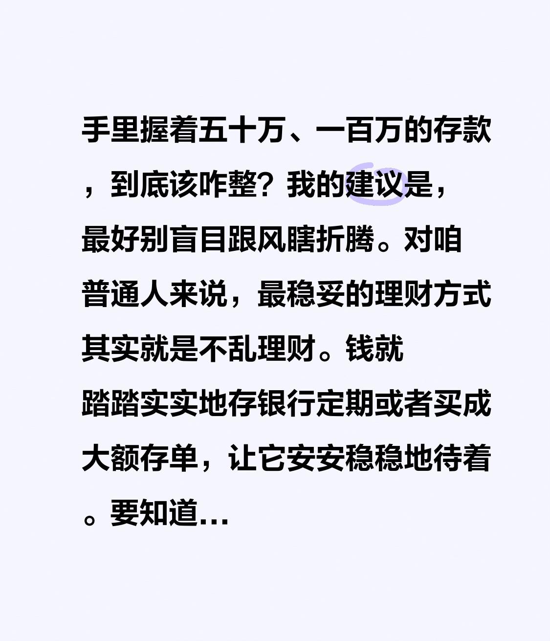 手里握着五十万、一百万的存款,到底该咋整?我的建议是,最好别盲目跟风瞎折腾。对咱普通人来说,最稳妥的理财方式其实就是不乱理财。钱就踏踏实实地存银行定期或者买成大额存单,让它安安稳稳地待着。要知道,钱花出去那是一瞬间的事儿,可再想赚回来,可就难上加难了。 很多时候,咱得正视自己就是个普通人的事实,既不是投资天才,也没那等天上掉馅饼的好运。要是真有好事主动找上门来,咱反而得留个心眼儿,琢磨琢磨这么好的事儿为啥就偏偏轮到自己了? 好多人手里有钱了还是焦虑,很大一部分原因就是想法太多,永远不满足,总想着赶紧赚更多。天天研究股市怎么快速捞钱,琢磨着换成美元该怎么存更划算,结果把自己累得够呛,折腾半天也没见多赚几个子儿。 其实啊,有钱了之后,最先考虑的不应该是急着去干啥大事儿,而是得琢磨怎么保住这些钱,别让它莫名其妙地变少了。 还有不少人,刚赚了十几万就迫不及待地全拿出来,供一辆三十多万的车,这不是给自己找罪受吗?这十几万根本算不上是你的财富,弄不好还成了你的“灾难”。要是没这十几万,你可能压根儿就不会考虑去负债买车。欲望超过了实力,就只会提前透支,这就是为啥总有人付不起钱的根本原因。 你瞧瞧身边,赚了几十万还能稳住心神、不买大件的人,真没几个。一到年底,朋友圈里提车晒幸福的,那是一抓一大把。 大家一定要记住,只有抵住这些诱惑,老老实实完成原始积累,才算勉强沾上了富人的边儿。