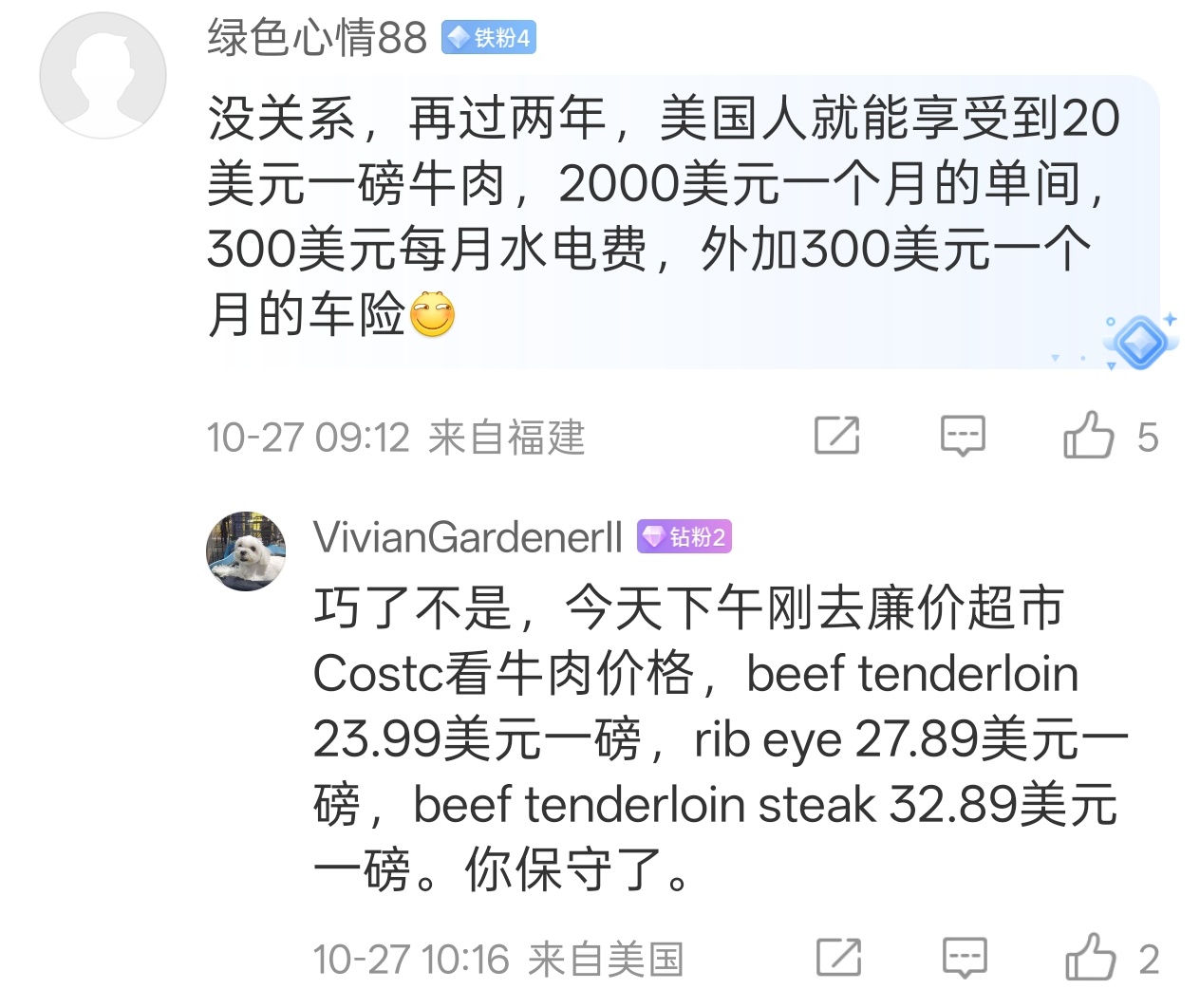 上面那位网友还是太守了,现在美国人就在享受20多美元一磅的牛肉(还是冷冻牛肉,并非国人常买的鲜牛肉),1500~2000美元/月的单间,300至500美元的每月水电费,300~500美元/月的车险[二哈]