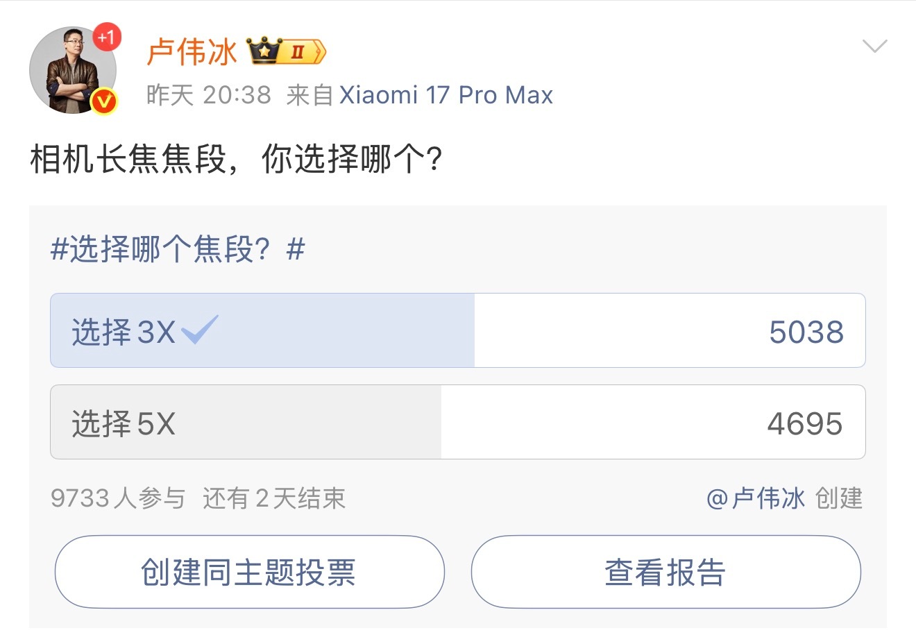 啊?卢伟冰发了个投票,长焦焦段这俩需求这么胶着?