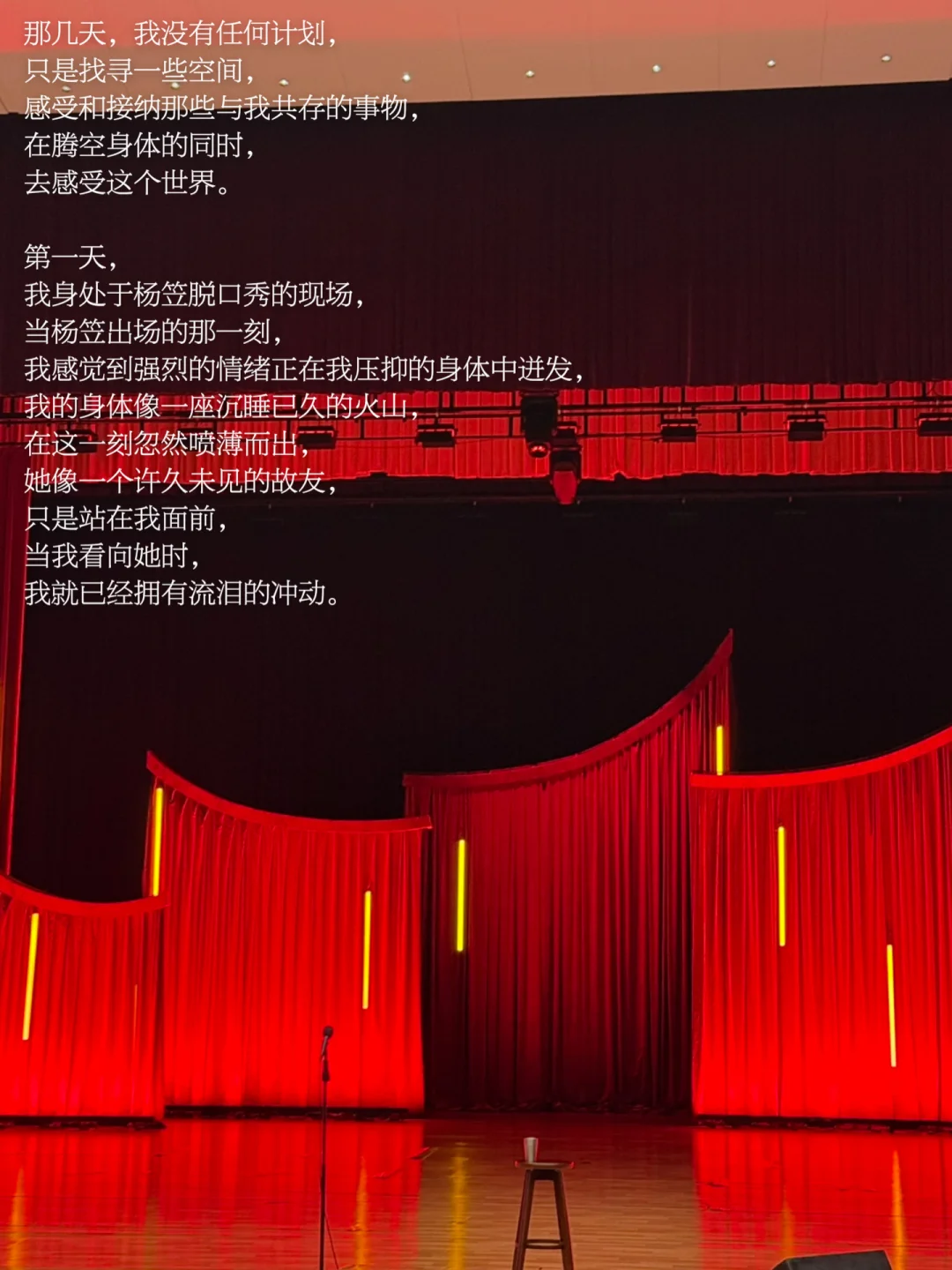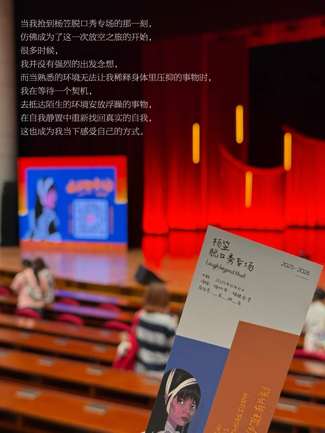 当我抢到杨笠脱口秀专场的那一刻,仿佛成为了这一次放空之旅的开始,很多时候,我并没有强烈的出发念想,而当熟悉的环境无法让我稀释身体里压抑的事物时,我在等待一个契机,去抵达陌生的环境安放浮躁的事物,在自我静置中重新找回真实的自我,这也成为我当下感受自己的方式。