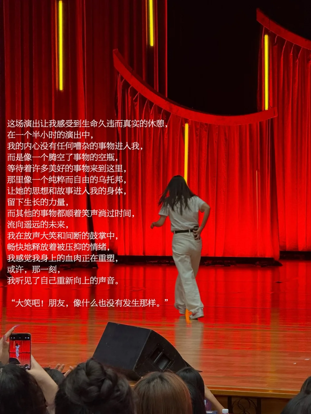 这场演出让我感受到生命久违而真实的休憩,在一个半小时的演出中,我的内心没有任何嘈杂的事物进入我,我在放声大笑和间断的鼓掌中,畅快地释放着被压抑的情绪,我感觉我身上的血肉正在重塑,或许,那一刻,我听见了自己重新向上的声音。