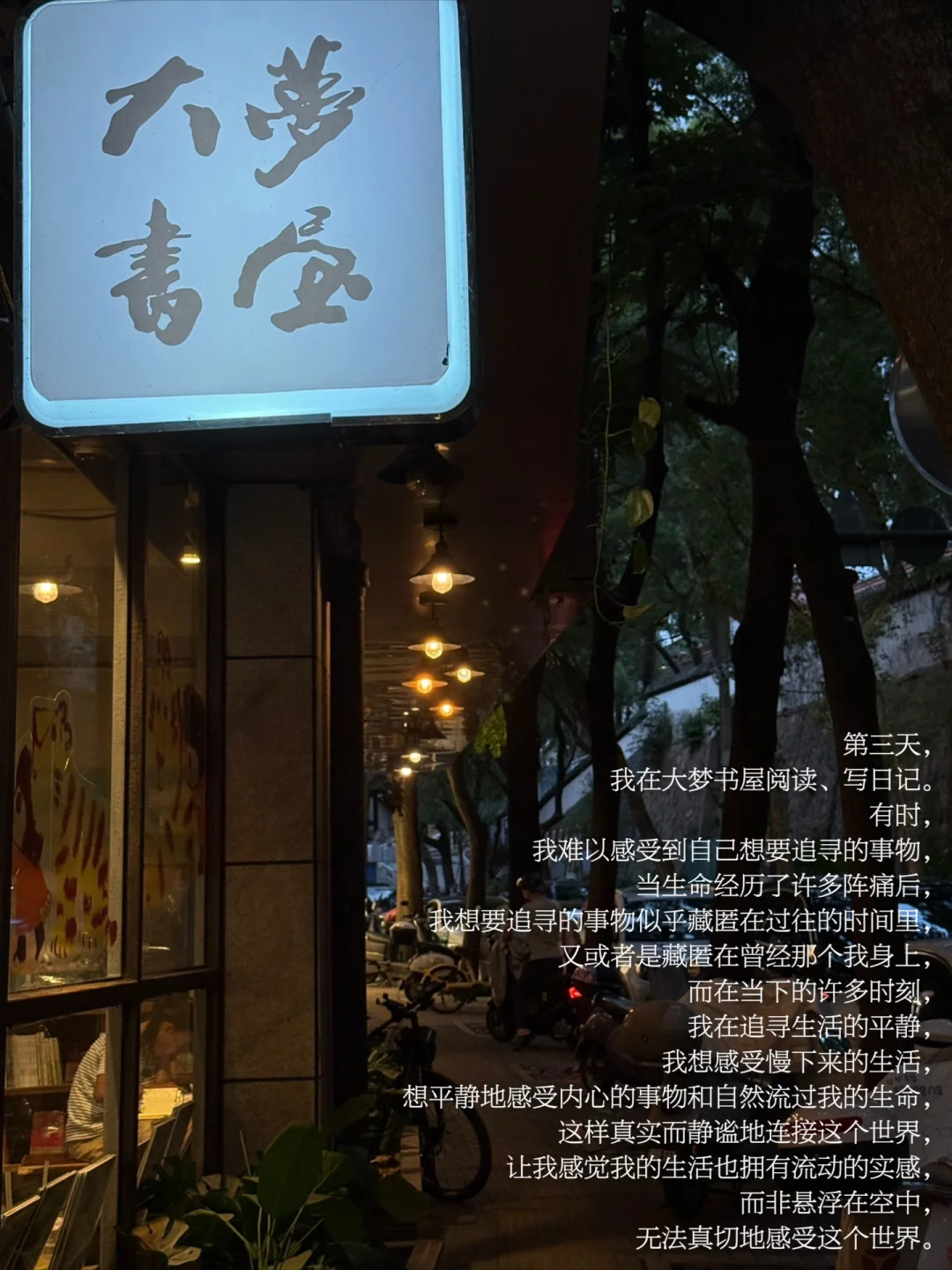第三天,我在大梦书屋阅读、写日记。有时,我难以感受到自己想要追寻的事物,当生命经历了许多阵痛后,我想要追寻的事物似乎藏匿在过往的时间里,又或者是藏匿在曾经那个我身上,而在当下的许多时刻,我在追寻生活的平静,我想慢下来,平静地感受内心事物和自然流过我的生命。