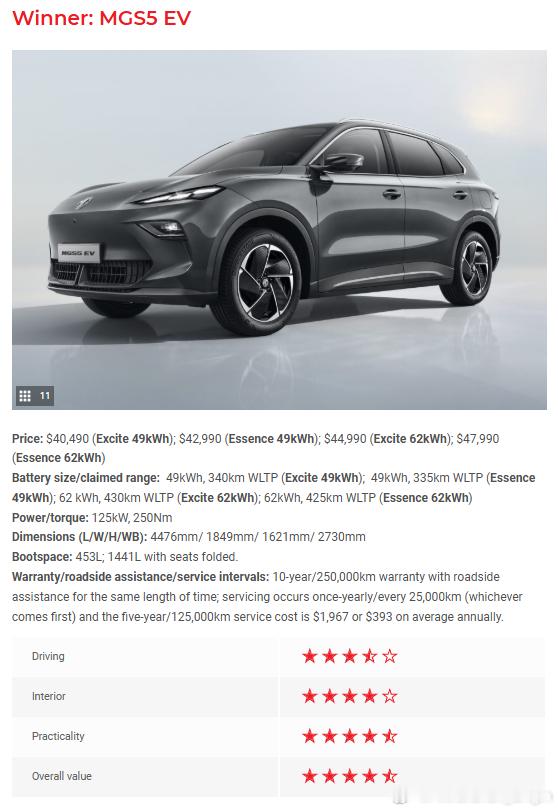 澳洲汽车市场 MG名爵 S5 EV 荣获由澳大利亚知名媒体 Wheels Media 颁发的 2025 年度最佳中型电动 SUV 奖项。