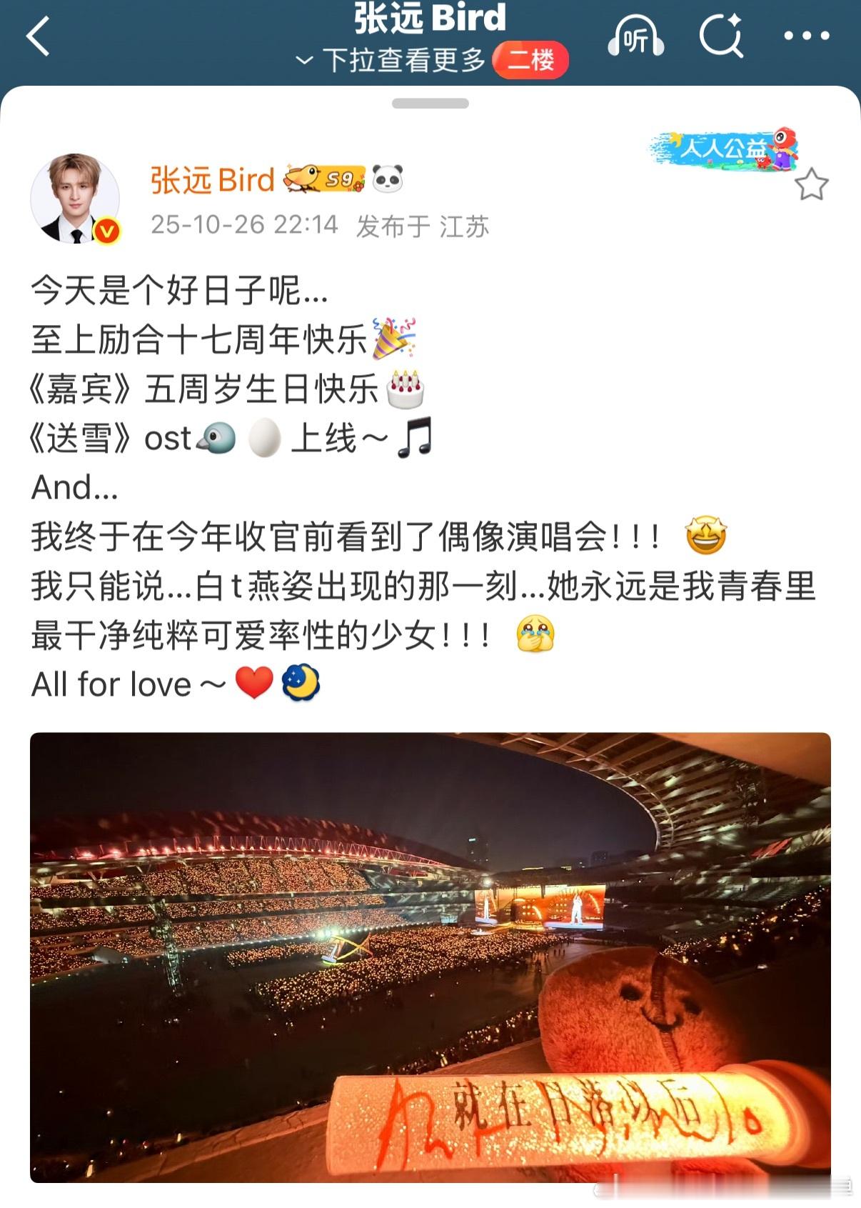 张远一下班就去了孙燕姿演唱会张远的追星日常也太真实了!刚忙完音乐节下班,第一时间就去孙燕姿演唱会,虽然晚到了一小时,但坐在台下认真听歌的模样,完全是小粉丝见到偶像的状态,这份热爱好纯粹!