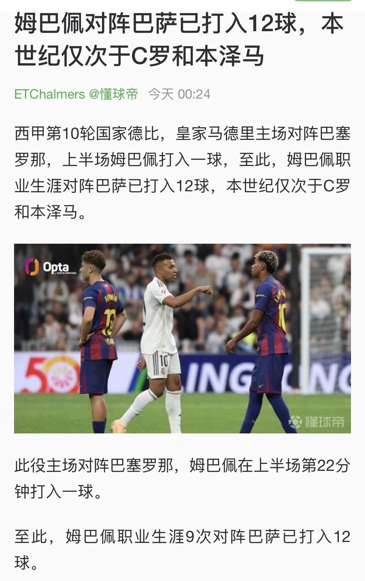 西班牙国家德比,姆巴佩打入1球。至此,姆巴佩职业生涯9次对阵巴萨已打入12球。转会皇马后,神龟在5场国家德比中轰入6球,效率之高已远超C罗。 前4场德比,尽管皇马全输了,但姆巴佩依旧斩获5球,包括一个帽子戏法。可见上赛季主要还是皇马的结构性问题以及主教练的指挥不当,姆巴佩个人能力没得说。皇马目前领跑积分榜,还拿下死敌,争夺联赛冠军还是很有可能的。