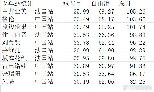 花样滑冰大奖赛前两站结束后,女子单人滑实际比出来的BV(难度基础分值)排名,我是统计了世界上的主要强手和中国选手。