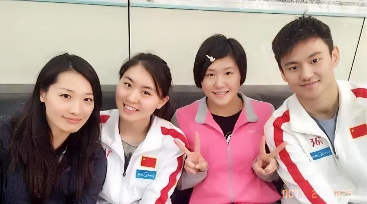罗雪娟、焦刘洋、叶诗雯三位奥运冠军,和世锦赛冠军宁泽涛的友情合影。宁泽涛在职业生