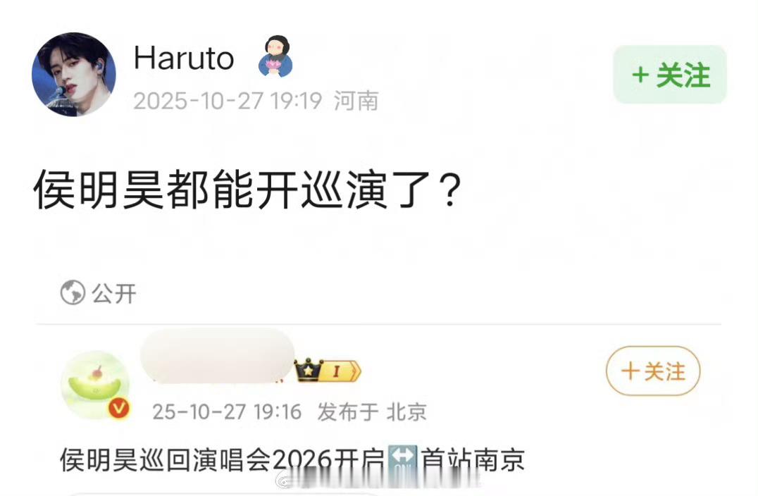瓜主爆料侯明昊要开巡回演唱会,2026开启,首站南京。