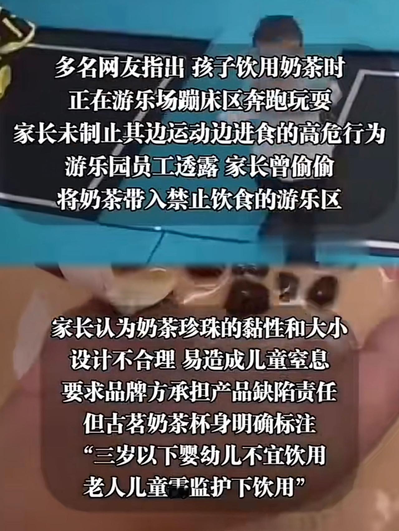 浙江台州一个4岁男童的悲剧,让人痛心不已。家长通过小程序下单珍珠奶茶,同行大人取餐后孩子饮用,之后在游乐场玩蹦床时,被奶茶里的颗粒噎住窒息身亡。监控显示,孩子在蹦床上突然状况不对,挣扎后倒下,整个过程不过几十秒。 家长质疑珍珠奶茶太黏,不适合儿童饮用,还认为奶茶店、游乐园运营方和商场方都该担责。这起事件给所有家长敲响了警钟,一定要注意孩子的饮食安全,珍珠奶茶这类饮品,对于年幼的孩子来说确实存在很大风险,千万别让类似的悲剧再次发生。
