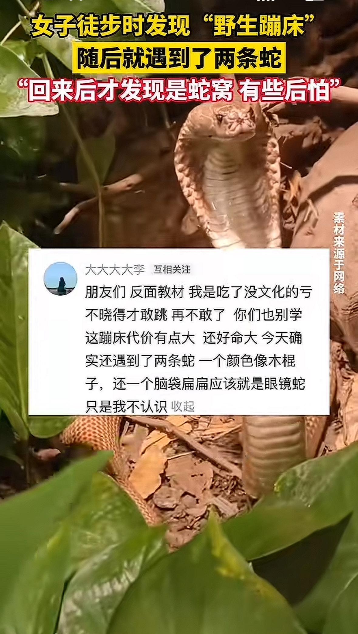 近日江西上饶,李女士徒步时可真是经历了一场刺激事儿。她碰到一处落叶堆积、地面松软的地方,感觉像“野生蹦床”,脚感软软的,就开心地蹦跳起来。可蹦完一转头,居然碰见两条蛇,吓得她赶紧撤。 当时山里没信号,她和同伴徒步拍摄近3小时,遇蛇后花1.5小时才撤离,要是被咬了根本没法求助。回来发视频,看评论才知道那是蛇窝,想想都后怕。这也给大家提了个醒,野外徒步得多了解些知识,不然像李女士这样误蹦蛇窝,可太惊险了。