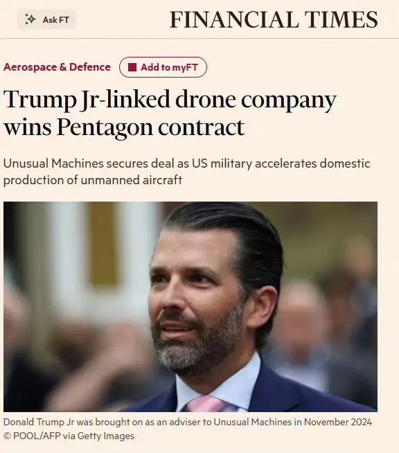特朗普儿子持有约400万美元股票的初创公司Unusual Machines ,赢得了五角大楼最大的无人机零件供应合同。