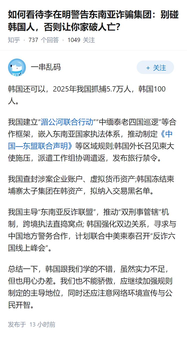 如何看待今年6-8月中泰柬联合执法,抓获并遣返100多韩籍诈骗分子,被知乎网友怒