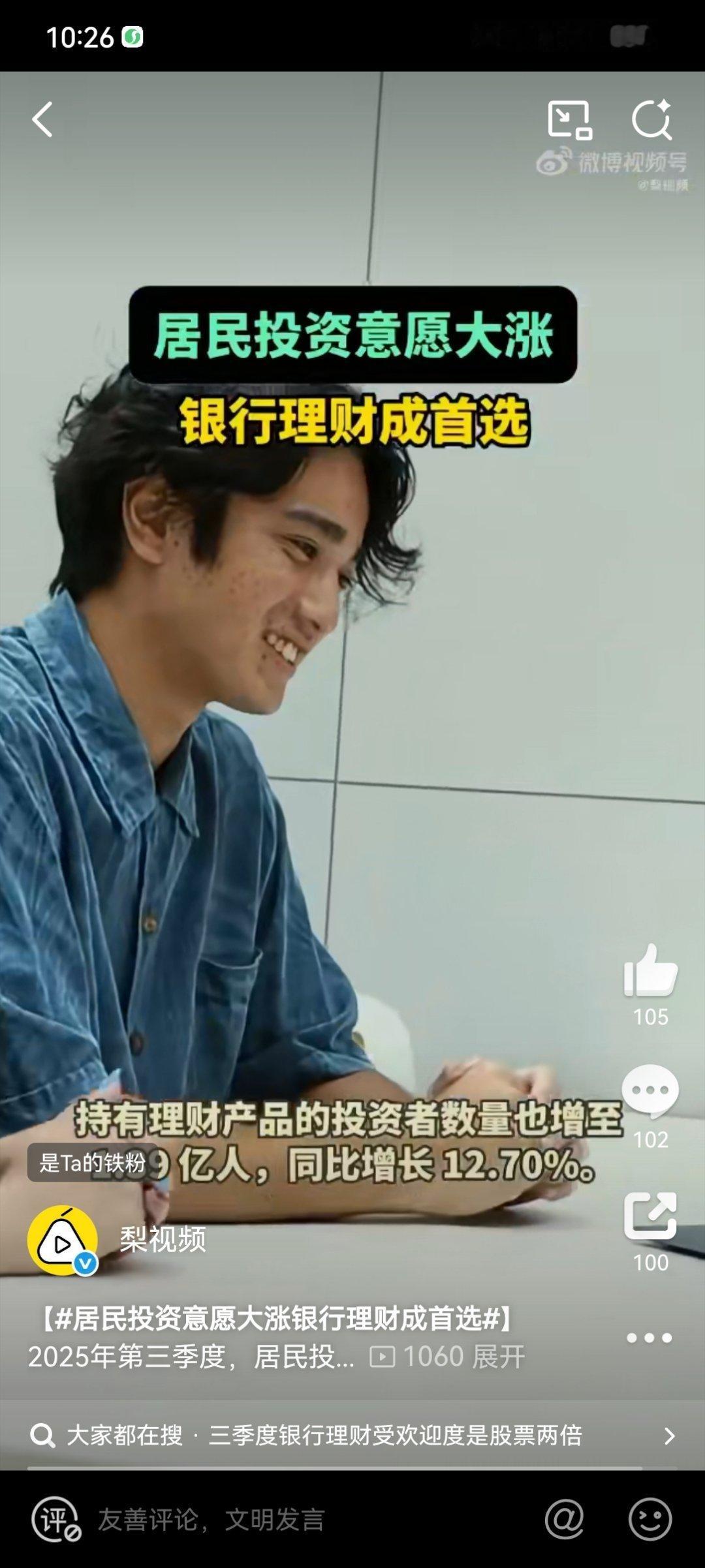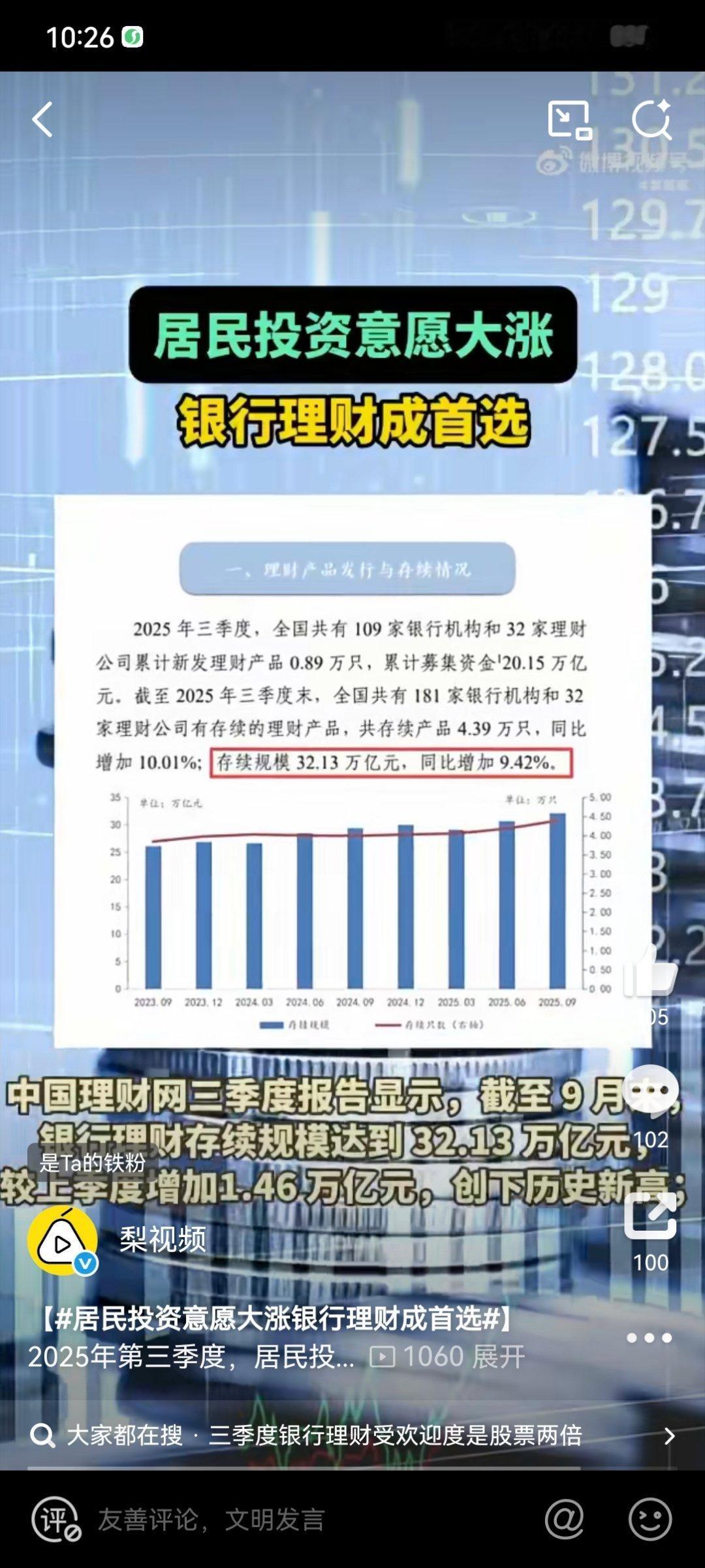 居民投资意愿大涨银行理财成首选居民投资意愿创新高,银行理财成首选,反映当下稳健为上、收益求实的理财心态。在利率下行背景下,2.58%的年化收益虽不算高,却胜在安心。理财规模破32万亿,说明更多人开始为财富“穿防弹衣”。三季度银行理财受欢迎度是股票两倍
