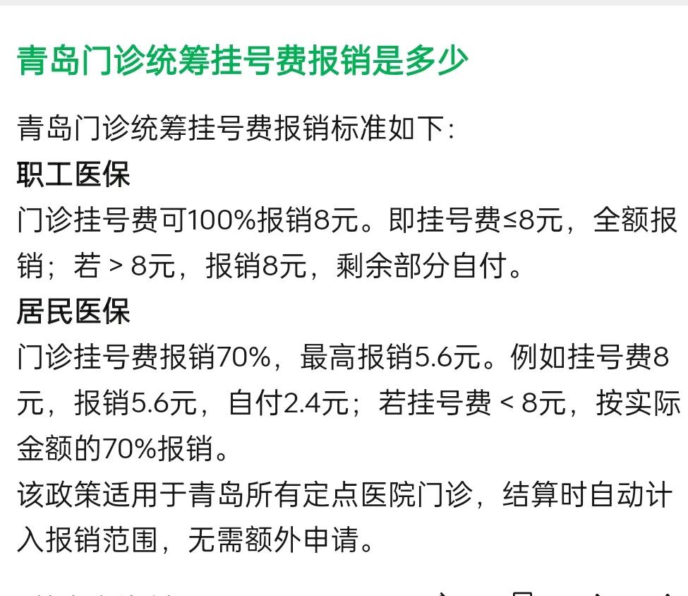 坐标青岛市,大家广而告之,自25年8月起,青岛市看病掛号费可用门诊统筹报销8元