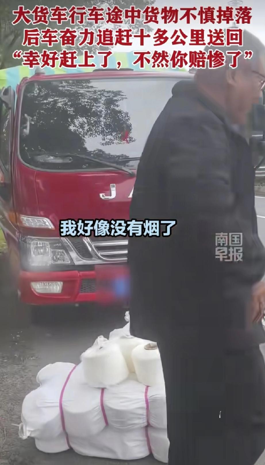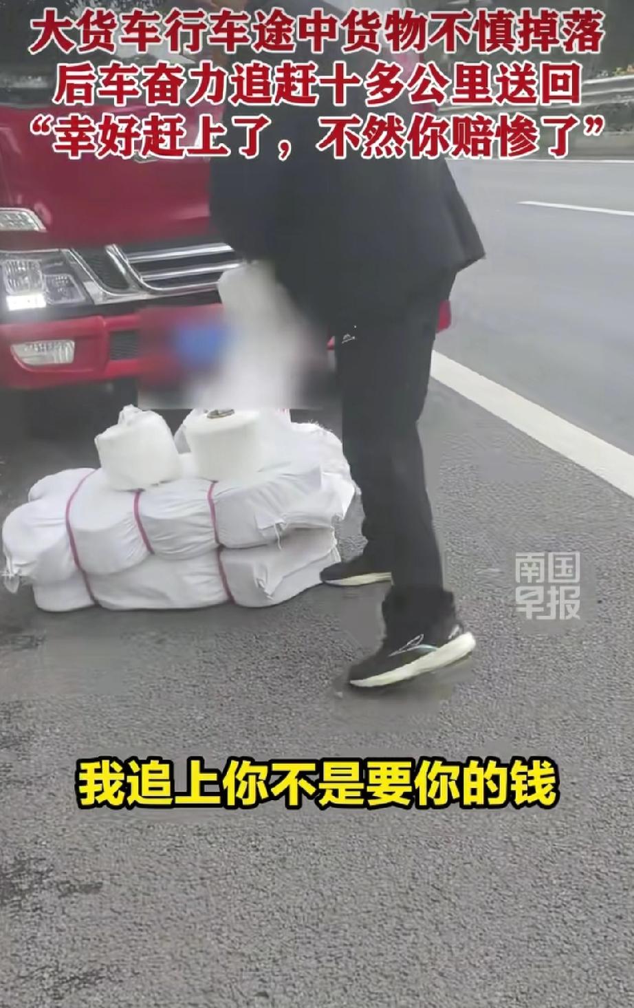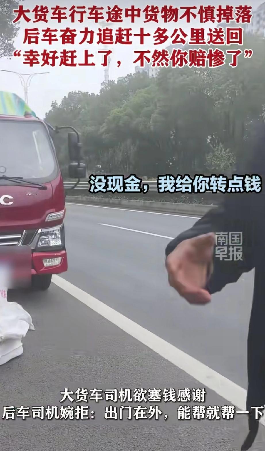 江苏,一辆大货车上的货物掉落至马路上。后面小车的司机瞧见后,赶忙停车拾起地上的货物放到后备箱,接着驾车去追赶大货车。 追了十几公里,才追上那辆大货车。小车司机摇下车窗,一边按喇叭示意,一边大声喊道:“你的货掉了。” 货车司机一看到小车,满脸疑惑地停下车,这才发现货物掉了。 小车司机说道:“看看是不是你的货,幸好追上你了,不然你可就赔大了。” 货车司机一边从小车后备箱取出货物,一边感激地说:“太谢谢你了,不然货主真会让我赔钱的。我没现金,转点钱给你吧。” 汽车司机赶忙摆手拒绝:“不用不用,出门在外都不容易,顺手帮个忙而已。” 货车司机手足无措地摸了摸口袋:“我的烟呢?我去车上拿包烟给你。” 小车司机连忙推辞,开车离开了。 我想,此时两位司机的内心都是愉悦与感动的。 真好,没有出现争抢遗落货物的场面,只看到拾金不昧的温情,这便是人与人之间的善良。 来源:南国早报