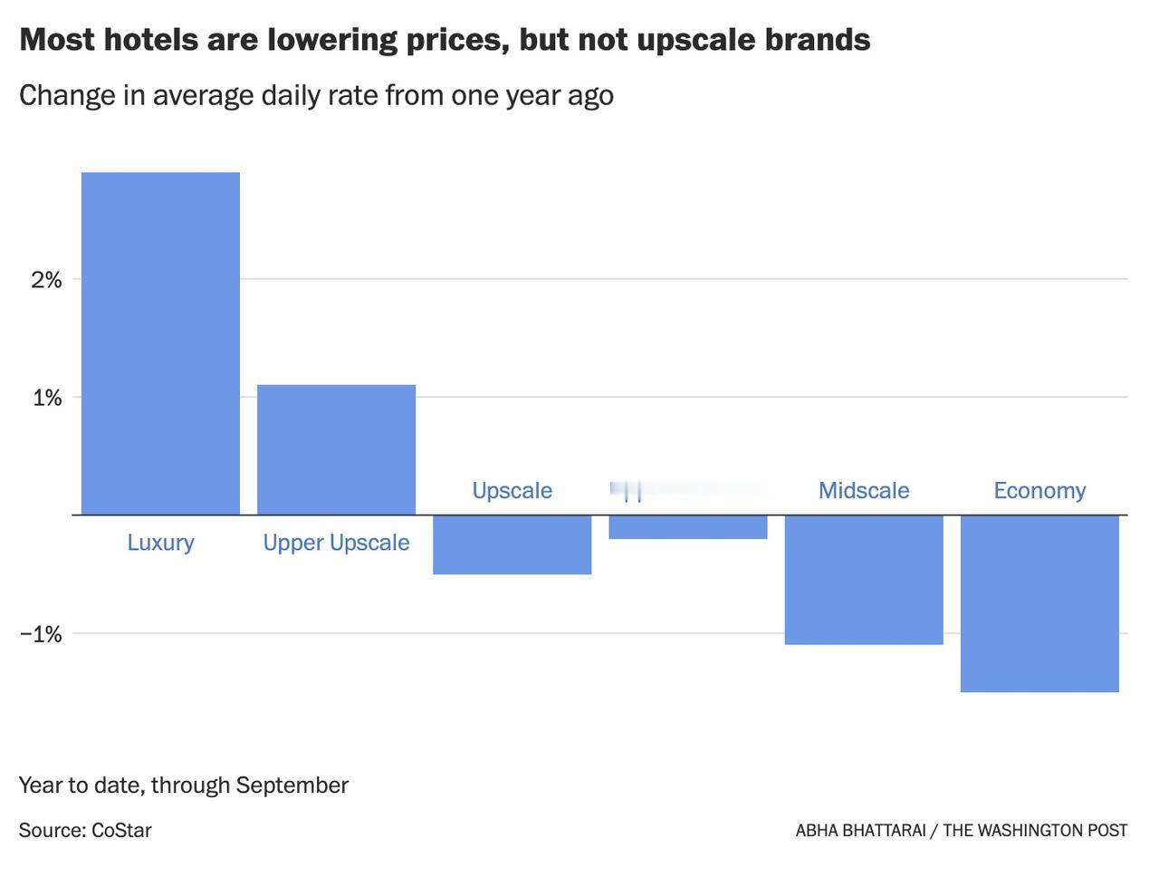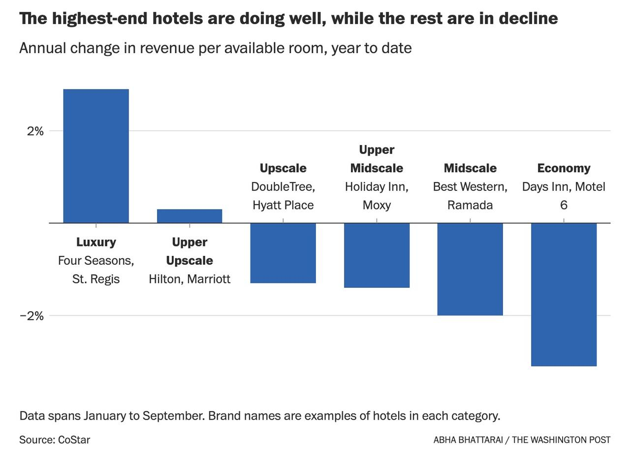 鸿沟在扩大。房地产市场放缓,但价值百万美元的房屋和高端汽车却在畅销。酒店的对比极为明显:整体预订量和价格下滑,但四季酒店、丽思卡尔顿酒店和瑞吉酒店等奢侈品牌今年上涨了 2.9%,而经济型酒店则下降了 3.1%。