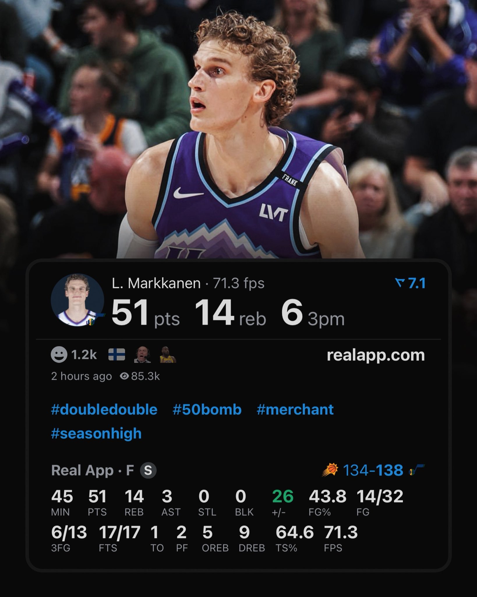 马尔卡宁[超话] 马尔卡宁对阵太阳拿到:51分,14篮板,6个三分!