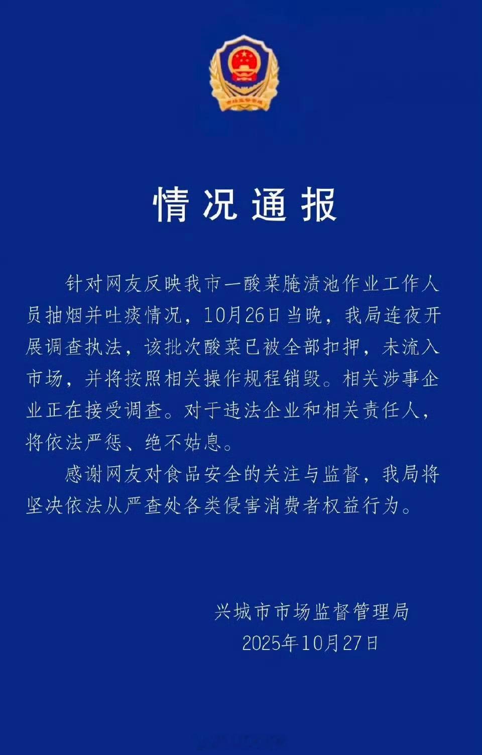 辽宁兴城通报工人酸菜池抽烟吐痰:该批酸菜被扣押未流入市场,将严惩违法企业和责任人[并不简单]