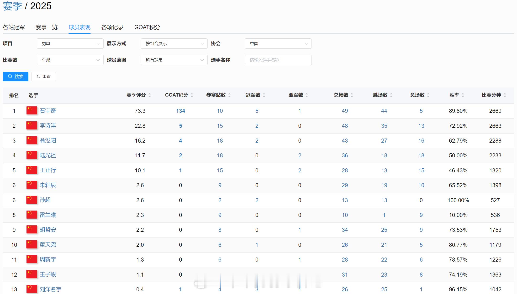 国羽25赛季球员表现