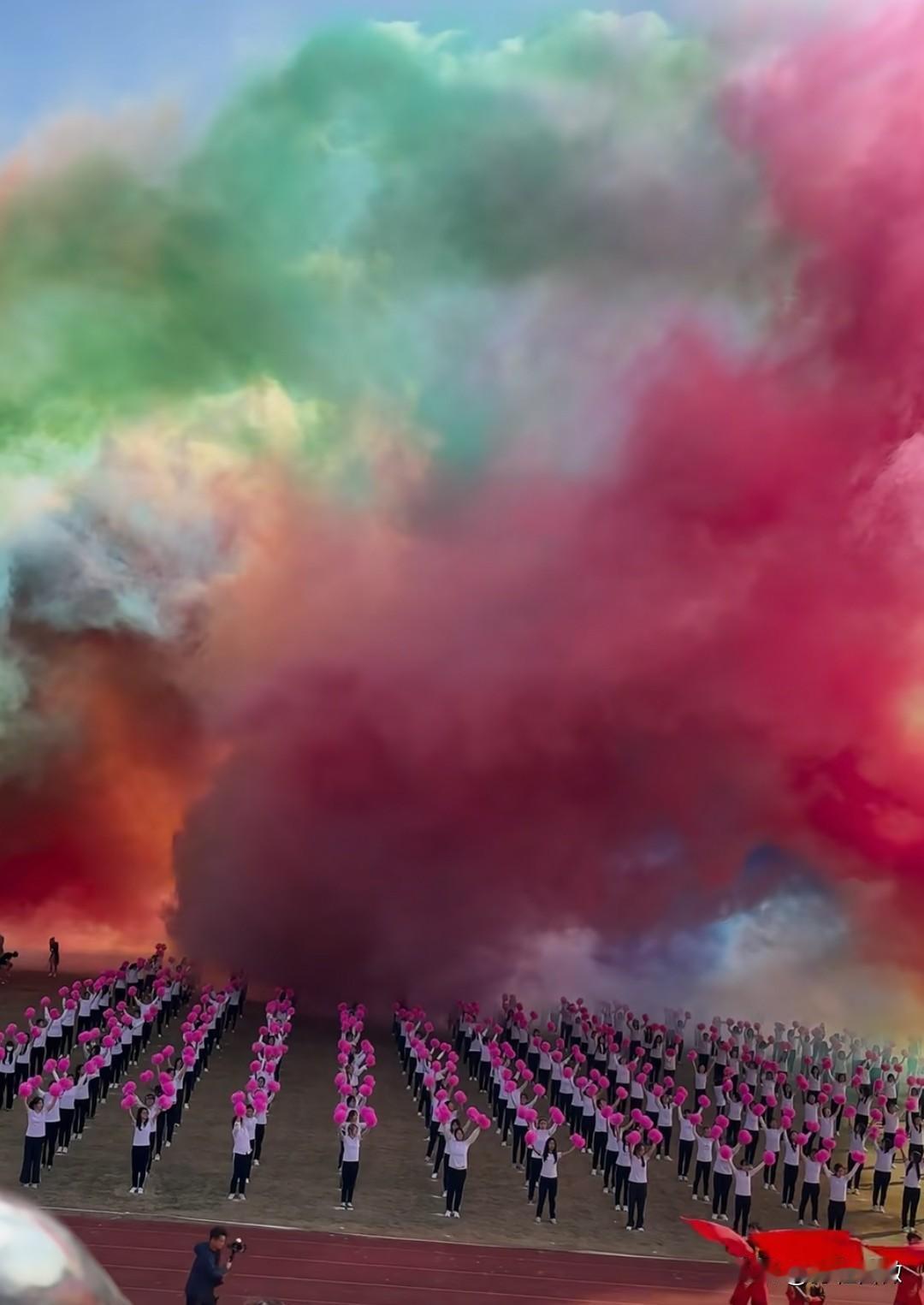 蔡国强没想到 始祖鸟也没想到 烟花秀的风口刚过,就有一大学在校运动会开幕式上演五彩烟雾。 近日华东师范大学的运动会开幕式上,就上演了一幕绚烂的烟雾表演,架势之大,几乎要把操场全部笼罩。 学校的学生也是遭了殃,正在表演的学生就不说了,站在观众席的同学都赶紧捂着鼻子往外跑,估计在场的人回去鼻子里全是五颜六色的。 不知情的人还以为蔡国强到这个学校来了呢,污不污染环境另说,就这次运动会开幕式肯定是领导和学生这辈子都忘不掉的了。 也不知道学校是怎么安排的,这种规模的烟雾,好看确实是好看,单就没考虑到会影响开幕式的秩序吗? 对此你们怎么看呢?