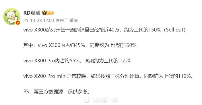 1、vivo X300系列首周销量同比达到上一代150%(只算两杯),算三杯的话是110%;