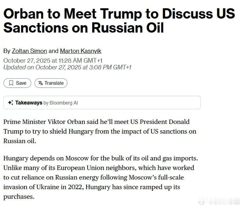 1、匈牙利总理欧尔班表示,他将在华盛顿与特朗普会面,寻求保护其免受美国对俄罗斯石油新制裁的影响。尽管匈牙利可以通过克罗地亚获得替代能源,但其对俄罗斯原油的依赖程度仍在增加。美国北约特使惠特克表示,布达佩斯“尚未采取任何积极措施”来减少这种依赖。