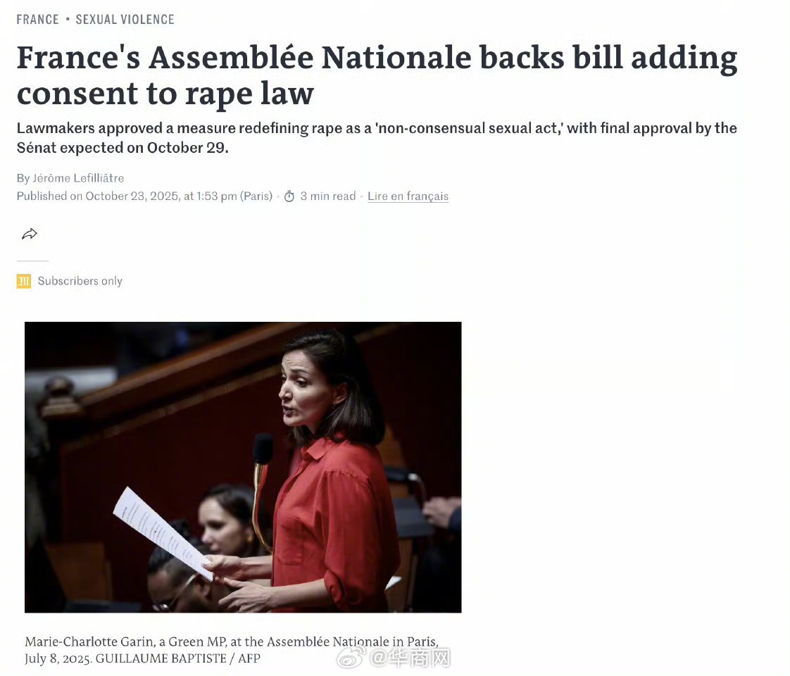 【#法国拟将性同意概念纳入刑法#】#法国明确沉默或不反抗不代表性同意#据外媒报道,法国刑法中对强奸和性侵犯的定义即将被重写。法国国民议会于10月23日投票通过了将“性同意(consent) ”概念纳入法律的提案。在186票中,155名议员以压倒性多数通过了该法案。这项对法国法律的重大修改将于10月29日在参议院进行最后一次投票。