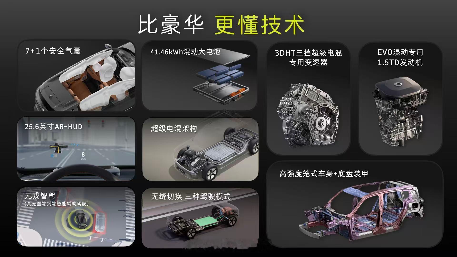 雷神电混2.0 + 1.5T混动配合3档DHT,馈电油耗4.4 L/100km,有120km和252km两个纯电续航版本。智能辅助依然是元戎的智驾系统,端到端大模型,双Orin X 芯⽚算⼒508 TOPS,可实现无图⾼速及城区NSP Pro等功能。