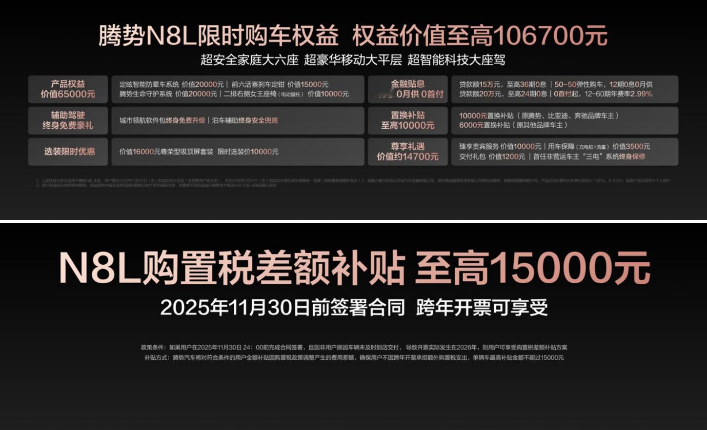 豪华大六座腾势N8L今晚上市,起步29.98万,相较于预售时少了2万,诚意十足。