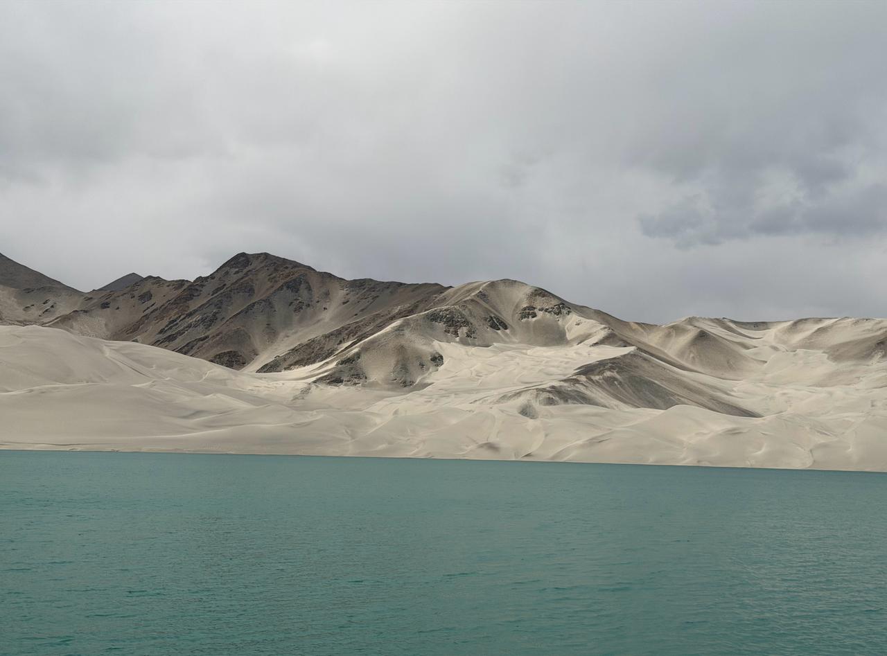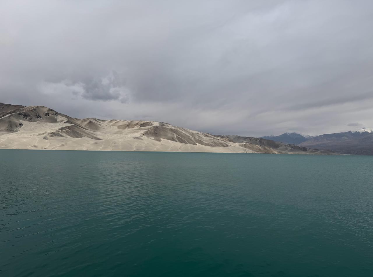 南疆行(五) 今天出发帕米尔高原,目标是塔什库尔干塔吉克自治县。 车出喀什,沿G314中巴友谊公路一路向南,10点45分抵达白沙湖。白沙湖湖水碧绿,清澈见底,似一块绿宝石镶嵌在帕米尔高原上,湖的对面是白色的沙山,不得不感叹大自然的鬼斧神工。 在白沙湖玩了一个多小时,继续向南行驶,雪山离我们越来越近,阳光照在雪山和金黄的树叶草地上,斑斓多姿,美不胜收。本想再去慕士塔格冰川公园,但伙伴中有一半的人出现程度不同的高反,只好放弃冰川,赶往塔合曼树洞公路,在那里又玩了一个小时左右,到下午18点30分到达塔县。