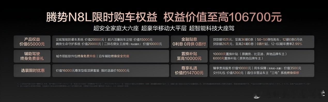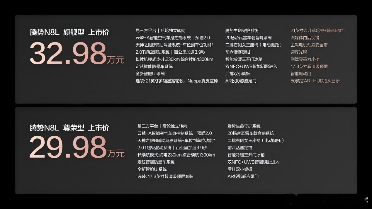 10月28日腾势N8L正式开售,就两款车,29.98万到32.98万,全系直接拉满“六大核心科技”,家庭用车要的安心、舒服、智能全给你安排明白!