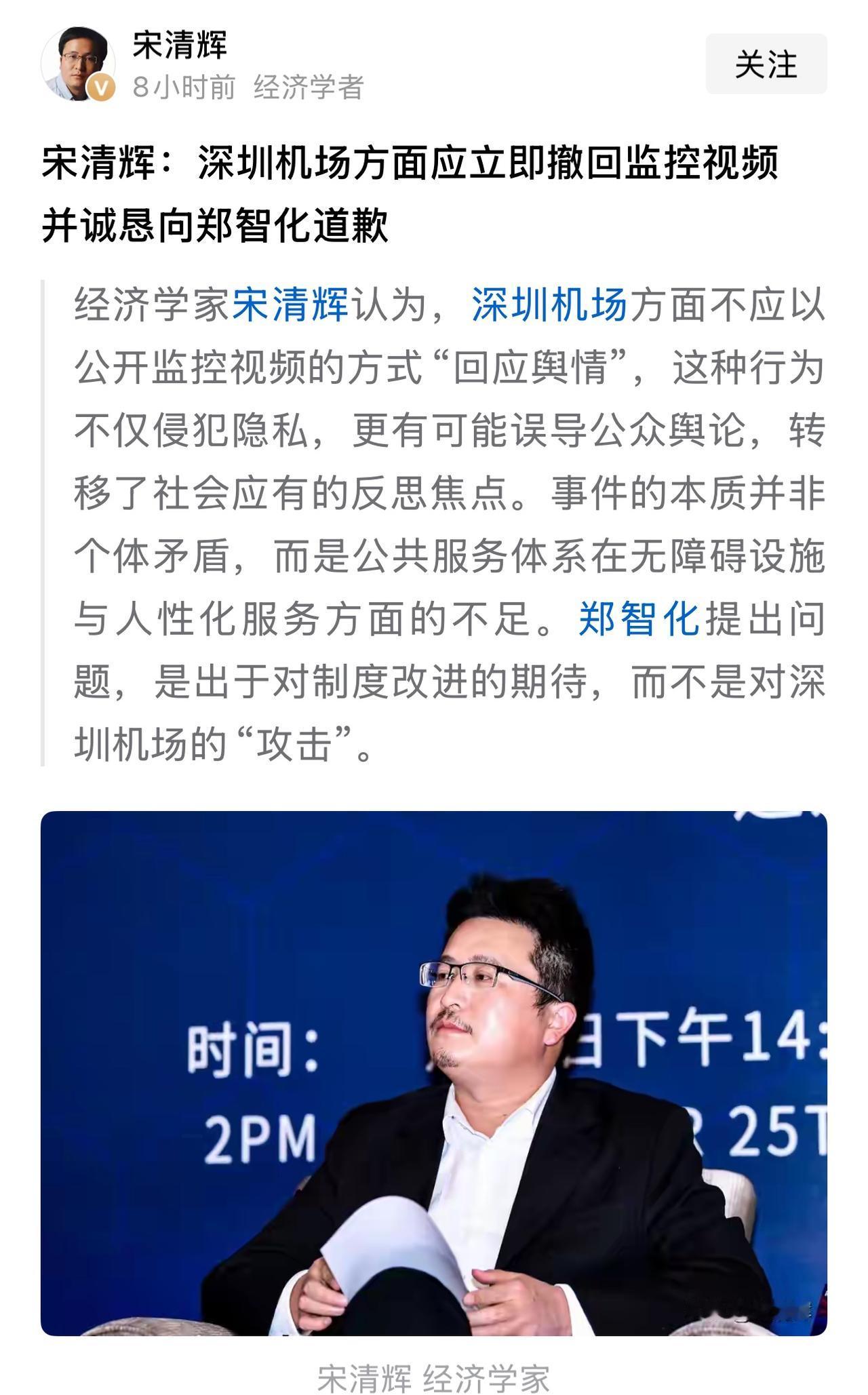 郑智化事件,网络上终于有个不一样的声音了,自称经济学家的宋清辉专家认为,深圳机场方面应立即撤回监控视频,并诚恳向郑智化道歉。 因为发布视频侵犯隐私,会误导舆论。 并认为郑智化的初衷是好的,并无恶意。 …… 大家觉得呢?