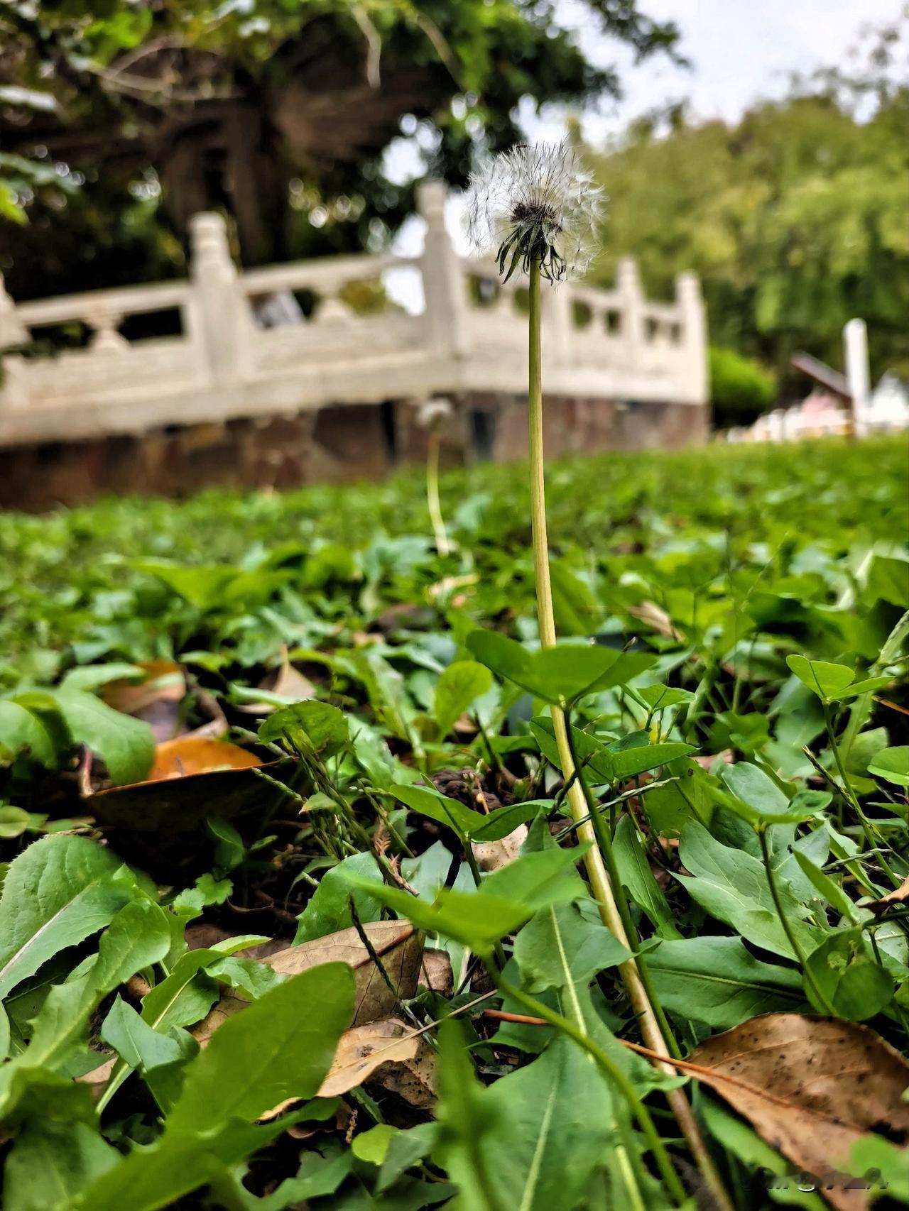 在公园草丛里偶遇这棵蒲公英,像个小毛球立在那儿,可可爱爱。 周围的绿叶、落叶衬