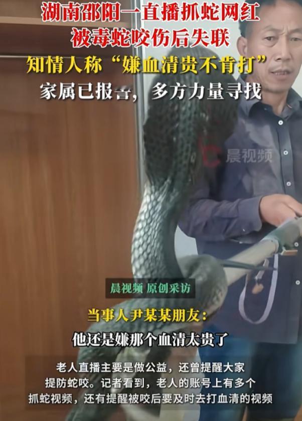 湖南邵阳一男子直播挖蛇,结果被银环蛇咬了,观众都劝他赶紧去打血清,他确实去了医院,结果检查之后,嫌弃血清4000多元太贵,竟然不告而别,至今下落不明,后来救援队发现了男子的踪迹,确定他没事,可是,男子看到救援队和民警后又跑了!知情人:他手机一直关机!   湖南邵阳洞口县的夜色里,头灯光柱晃得土坡上的碎石发亮。   59岁的尹华健戴着长袖手套,徒手往蛇洞里刨土,直播间里200多人盯着屏幕,连线的女主播突然喊出声:“赶快去医院!”画面里,他左手食指正冒血,捏着的银环蛇鳞片泛着冷光。   10月26日晚7点,尹华健没慌,对着镜头说“出了好多血”,6分钟后才拨通急救电话问血清。   对方给了人民医院号码,他再打过去确认有药,直播间观众悬着的心刚放下,没人料到后续的转折。   当晚尹华健赶到洞口县人民医院,急诊病历很快出来:左手食指银环蛇咬伤,伤口呈针孔样,右手背已经红肿,医生当即开了住院单,告知需要注射抗蛇毒血清。   可听到费用时,他变了主意,血清1400元一支,建议打两支,加上其他费用近5000元,他跟好友任先生打电话说“医生有血清没事”,转头却趁人不注意,自己开车溜了。   这下彻底乱了,村干部连夜组织10多人寻人,电话拨过去始终关机,强仁救援队从26日晚就没歇着,无人机在乡间上空扫了两天,28日下午终于在路边发现他的小汽车。   附近村民说清晨还见他在田里走动,可救援队员和民警刚靠近,尹华健撒腿就往草丛里钻,转眼没了影。   这事透着股荒唐,尹华健白天帮人卖橘子,一天挣200块,晚上直播挖蛇才几个月。   好友说他起初还用铁夹子,后来为了吸引关注干脆徒手抓,之前劝过他“迟早被咬”,他满不在乎。   更让人揪心的是银环蛇的毒性——神经毒素发作起来,几小时就可能让人呼吸衰竭,医学上早有定论,24小时内打血清是最佳时机,可他硬是扛了两天多。   医院后来解释,新农合能报销大部分费用,实际自己花也就一千多,尹华健后来联系记者,说自己用了草药,手指都变形了,否认炒作,可这些话没法让人心安。   要知道有医院统计过,不用血清治疗银环蛇咬伤,平均要住15天院,花2.6万元,比打血清贵五倍还多,遭罪更不用说。   直播间里他曾发过视频,提醒别人被蛇咬要及时打血清,轮到自己却犯了糊涂,手机关机、见人就跑,到底是心疼钱,还是怕被说炒作,没人能确定。   但明眼人都清楚,4000块买的是救命机会,拿这个赌运气,实在不值。   截至搜救最紧张的时候,尹华健已经失联超过48小时,救援队员带着装备在草丛里穿梭,反复喊着“先治病,钱的事好说”。   夜色里的呼喊没得到回应,只留下路边孤零零的汽车,像个沉默的问号,为了博眼球冒的险,为了省点钱犯的浑,在生命面前到底算什么?