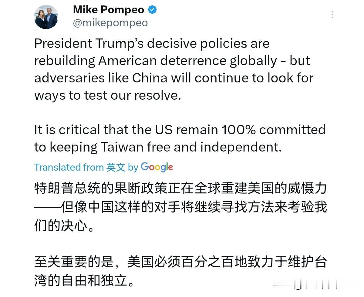眼看中美将有可能在韩国举行高峰会,蓬佩奥跳出来大放厥词了!10月29日,蓬佩奥放话声称,鉴于中国决心取代美国成为世界领导者并最终控制印太地区,重申美国对台湾的支持至关重要。美国必须向北京发出明确的信息:台湾是自由的,台湾是“独立”的——而且将保持这种状态。鉴于中国对台湾的意图如此明确,这种战略清晰度尤为重要。 美国对台湾问题刻意含糊其辞,这只会助长北京对台湾的“侵略”姿态。它误导了国际社会,并加剧了该地区的风险和“侵略”行为,而我们本应努力减少这些风险和侵略行为。呼吁美国政府正式承认台湾“从未”成为中华人民共和国的一部分,台湾是——也应该是——一个自由独立的“国家”。很显然,在韩国将有重要峰会举行之际,蓬佩奥又出来摇唇鼓舌了。 不过,谁都看的出来,卸任之后,被闲置在一边,对特朗普已经毫无影响力的蓬佩奥明显是以此讨民进党的欢心,多骗一些经费而已。在台上的时候,蓬佩奥这种话从来不敢说,现在却口无遮拦,放飞自我,这就是典型的政客嘴脸。当然,美国总统特朗普本人的态度而言,在与高市早苗会晤时,特朗普对台湾问题一字不提,这说明特朗普本人对这一问题非常的慎重。 我们确实要解决台湾问题,因为台湾就是中国的一个省。美国如果不在台湾问题上慎重行事,这对于中美关系将会造成天翻地覆的冲击。而从实力角度而言,台海军力呈现一边倒的态势,美国介入台湾问题越来越力不从心,得不偿失,这就是现实状况。蓬佩奥的胡言乱语,不会改变我们要实现统一的这一基本态势,此人不过是一个无足轻重的失意政客罢了。