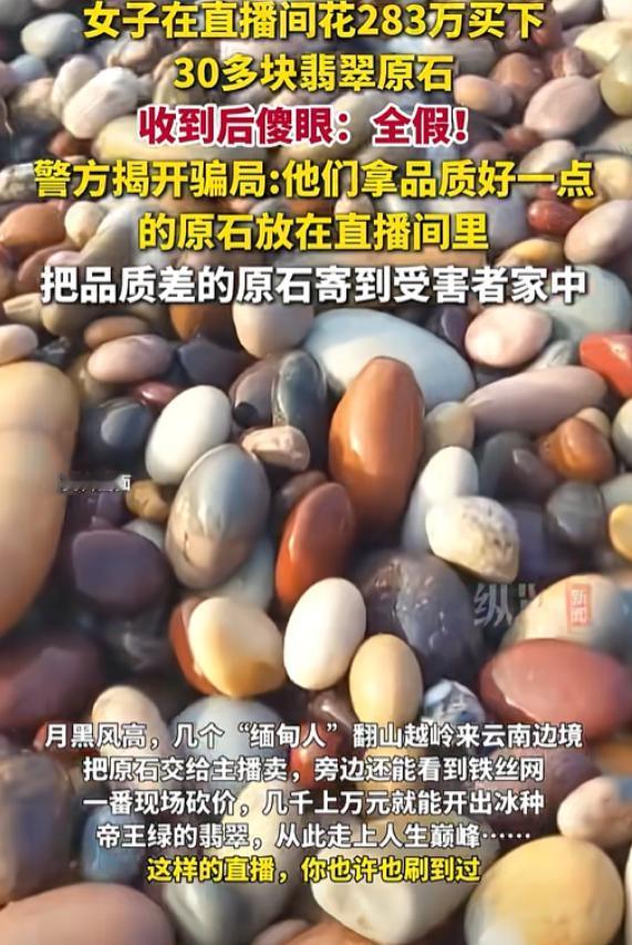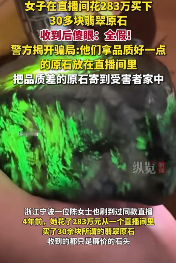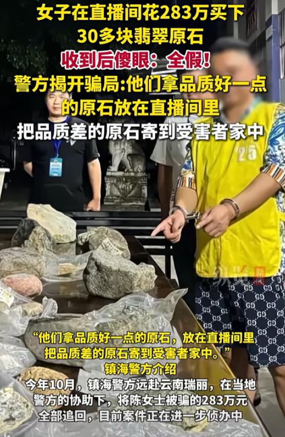 浙江宁波,陈女士为了赚大钱,竟然在直播间花283万,买下30多块翡翠原石,她满心期待,这些原石能能够翻几倍,结果到货后发现全是廉价石头,她立马找对方退款,期间拉扯了近4年时间,但始终没有结果,陈女士忍无可忍之下报了警!网友:我只关心这283万她怎么赚的。   浙江宁波的陈女士,前几年迷上了直播间“赌石”,屏幕里的戏码太勾人:主播站在带铁丝网的户外,说自己就在中缅边境,几个“缅甸人”要么翻山要么渡河,揣着原石直奔镜头前。   卖货的开口喊价几百万,主播立刻抢过石头,拿手电筒贴着表皮照,嘴里喊得激动:“看这水头!绝对能开出冰种、帝王绿!”   接着一顿猛砍,把价格压到几千上万,更热闹的是评论区,秒速弹出“我要了”“赶紧上链接”,看着都像真买家在抢。   陈女士越看越心动,想着靠这石头翻几倍赚大钱,陆续下手买了30多块,前前后后砸进去283万。   等包裹寄到家拆开,她当场傻了眼,哪是什么翡翠原石,全是些摸起来粗糙的廉价石头,别说帝王绿,连点翠色都见不着。   夫妻俩赶紧找主播退款,对方先是说“赌石有风险”,后来干脆拖时间,今天说财务不在,明天说主播去缅甸了。   陈女士不甘心,和丈夫专程跑到云南找对方,可连直播间的影子都没摸着,钱自然要不回来。   这一拖就是四年,283万像打了水漂,陈女士实在扛不住,今年六月走进了宁波镇海庄市派出所报警,民警一查,直播间的猫腻全露了馅。   哪有什么中缅边境?铁丝网是云南当地水库边的普通围栏,“缅甸人”是主播从街上拉来的临时演员,连那些抢着下单的“买家”,全是花钱雇的水军。   并且更损的是,主播直播时拿的是稍微像样的石头撑场面,寄给陈女士的全是挑剩下的废石。   十月十三号,镇海民警组队远赴云南瑞丽,联合当地警方动手,把283万全款追了回来。   二十三号那天,陈女士和丈夫捧着锦旗送到派出所,红绸子上“神警雄风雷霆出击”八个字格外醒目,   这事传开,网友吵翻了,有人直问“283万怎么赚的”,其实比起这个,更该当心的是直播间的“赌石”陷阱。   这些骗子摸准了人想“以小博大”的心理,编出边境拿货的戏码,用水军造热气氛,把廉价石头包装成暴富机会。   现在这案子还在侦办,但陈女士的钱能追回来算万幸,要知道,不少类似骗局里,骗子会让受害者签“风险自担”的协议,得手后就翻脸不认人。   所以也在这里提醒大家,别信那些“稳赚不赔”“能开帝王绿”的鬼话,真有好翡翠,轮不到在直播间砍价甩卖。