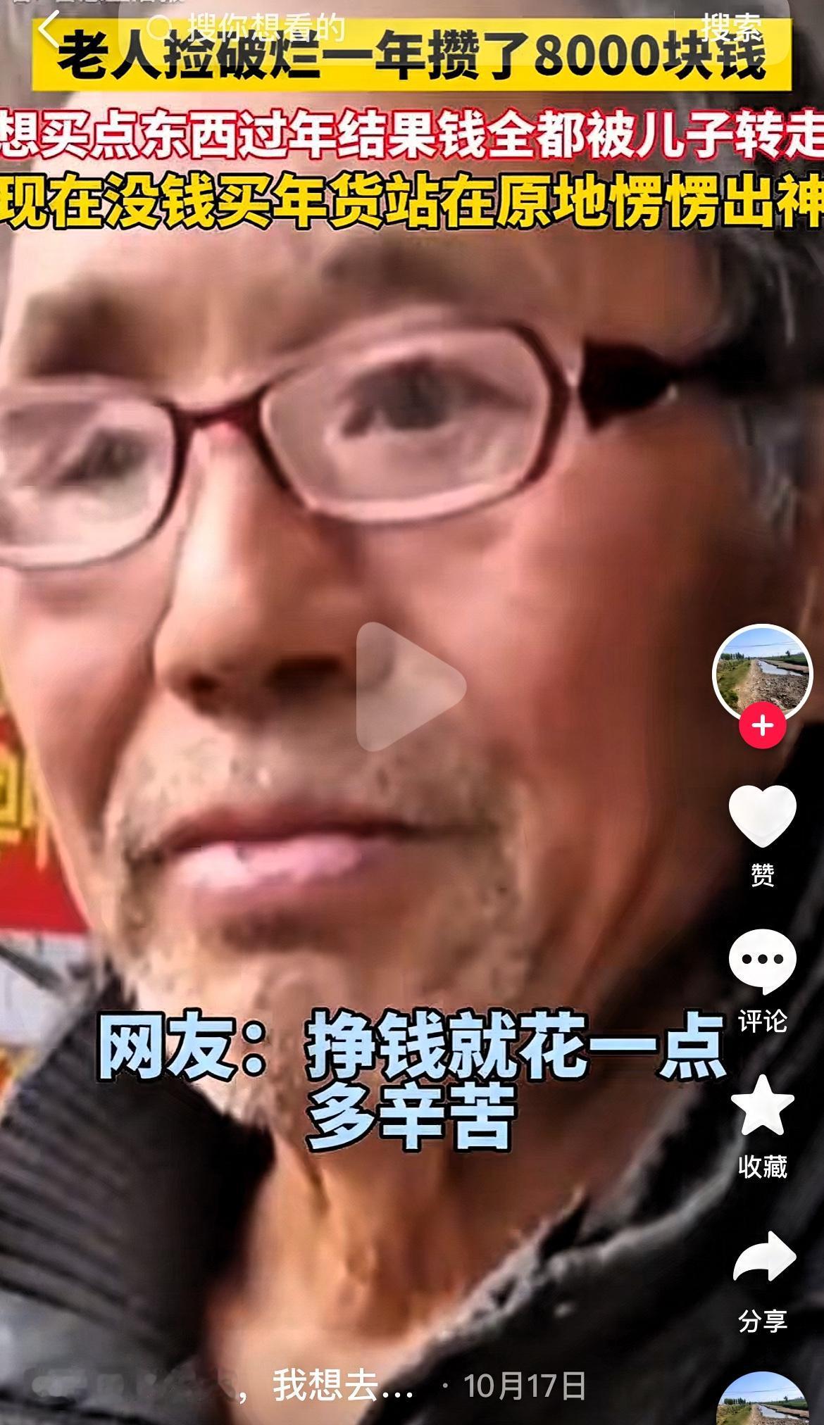 寒心呀! 老人捡破烂,一年攒了8000块钱,本想着过年买些年货,谁知道,儿子把钱悄悄地全转走了! 这哪是养儿?分明是养了个“吸血鬼” 老人发现钱没了的时候,站在原地愣了半天,那眼神里的绝望和无助,看着都让人心揪得慌。这8000块不单单是钱啊?是老人弯腰捡瓶子的每一次辛苦,是冬天冻得通红的手,是省吃俭用攒下的念想! 有人说“养儿防老”,可碰到这种只知道榨取父母血汗的儿子,防老都成了奢望,甚至成了“养老防儿”!连老人捡破烂的钱都要偷,这哪还有半点做人的底线?连最基本的孝心都没有,跟白眼狼有啥区别? 我真的想不通,怎么会有这样的子女?你们身边见过这种不孝顺的人吗?要是你们碰到这种事,会怎么帮老人?