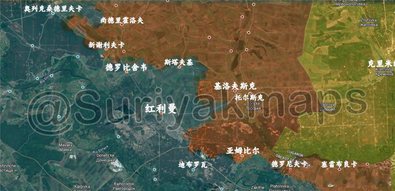 2、红利曼:俄军在基洛夫斯克以西的林区建立了新的阵地,并继续向红利曼发动攻势,抵达2号采石场郊区,城区东部住宅区完全处于灰色地带,因为乌克兰军队已从那里撤出,战斗逐渐转移到墓地,同时俄军开始向该市南部推进,从而切断了连接红利曼和赛弗尔斯克的道路。此外,俄军攻占了亚姆比尔的墓地和圣尼古拉斯教堂,还完全控制了德罗尼夫卡,并继续巩固北顿涅茨河的两处河段。