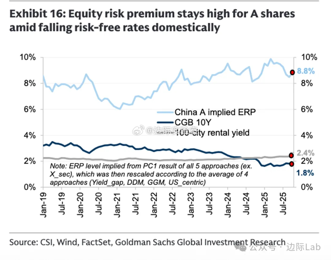 在中国国内无风险利率持续走低的环境下,A股市场的隐含股权风险溢价(ERP)却维持在8.8%的高位,与当前仅1.8%的十年期国债收益率和2.4%的百城住宅租金收益率形成显著偏离。这一分化使得权益类资产相对于债券及仍处负利差困境的房地产等其他国内资产类别,在估值上具备比较优势。该估值结构对利率变化表现出高敏感性,模型测算显示,实际利率每下降1%,理论上可带动指数市盈率提升约10%,显示出低利率环境中股票资产存在的潜在重估空间巨大。