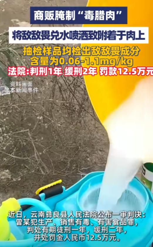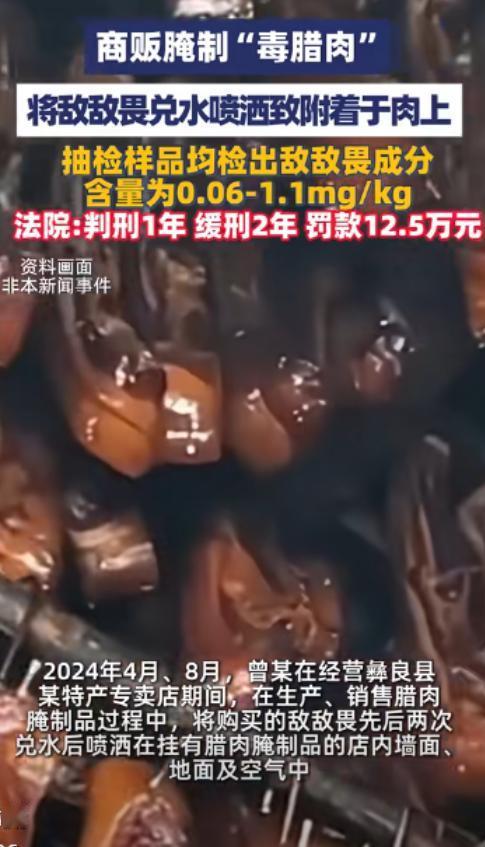 这胆子也太大了!2024年,云南一男子将500斤腊肉挂墙上,喷敌敌畏防腐,这些腊肉卖了10000多元,后来案发,被罚款125000元,判处有期徒刑1年,缓刑2年,网友:怎么这么轻?   云南彝良县有家特产店,老板曾某干的事能让人后背发凉,2024年天热起来,店里挂的腊肉开始招虫子,他不想办法正经防腐,反倒盯上农药敌敌畏。   4月和8月,曾某两回把敌敌畏兑水,拿喷雾器往挂满腊肉的墙面、地面甚至空气里喷。   他觉得没直接喷肉上就没事,药雾飘着附着在肉上,既能防虫又没人发现,就这样,猪脚、三线肉这些腌制品,带着农药残留往外卖。   从4月到9月案发,500多斤毒腊肉卖出去,进账一万多块,买的多是熟客,谁能想到红亮喷香的腊肉藏着剧毒。   9月3日,市场监管部门上门查封,当场扣下一千二百多公斤没卖的腊肉,三线肉、小猪脚、火腿堆得满满当当,光火腿就有155公斤,市场值五万多。   还搜出那瓶没用完的敌敌畏和作案的喷雾器,送去检测更吓人,所有样品都检出敌敌畏,含量从0.06到1.1mg/kg不等,而国家规定食品里这东西根本不许有。   1.1mg/kg那批,被专家说是高暴露风险,吃了轻则头晕呕吐,重则能要人命,老人小孩更危险。   法院判了:曾某犯生产、销售有毒有害食品罪,有期徒刑一年,缓刑两年,罚金12万5,已缴的3万只是零头。   违法所得一万块全追缴,扣下的腊肉、农药、喷雾器全没收,更狠的是,缓刑期内不准他再碰食品生意。   消息一出来,网友炸开锅:“这罚得够吗?判得是不是太轻?”其实法院有考量,曾某到案后全说了实话,还自愿认罪认罚,社区评估说他适合社区矫正,没再犯罪风险。   但这判决里藏着门道,12万5的罚金是销售额的十二倍,直接断了他靠违法赚钱的念想;从业禁止更是釜底抽薪,不让他再害食客。   有人说腊肉喷药是“土办法”,这哪是土办法,是明目张胆违法,敌敌畏早被列进食品违禁名单,跟肉里的脂肪结合后更难分解,吃进肚子就是慢性毒害。   曾某图省事省成本,把食客健康当赌注,这种小聪明,终究栽在法律手里。   现在看来,缓刑不是纵容,是宽严相济,既用罚金和从业禁止砸断他的违法路,也给了悔改机会。   但更该警醒的是,特产店的腊肉看着地道,安全不一定有保障,食品安全这根弦,商家松不得,毕竟没人想在餐桌上吃到“农药味”。