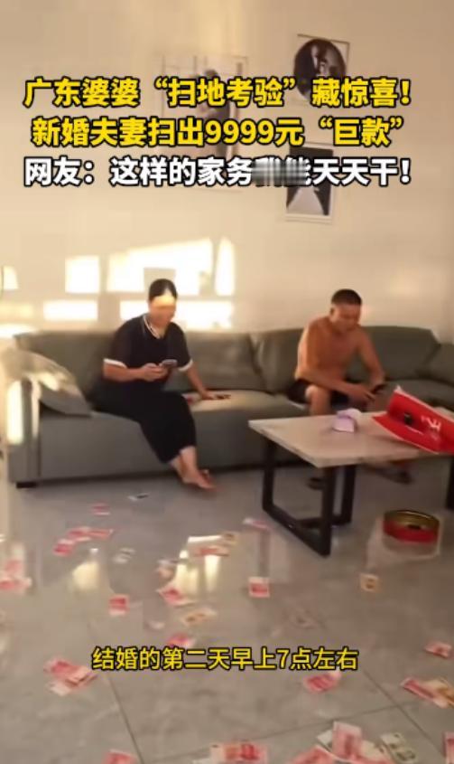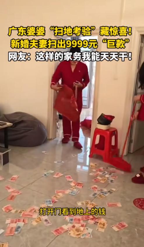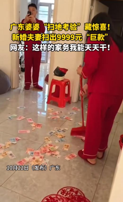这样扫地的话我能天天打扫!10月22日,广东一新娘和丈夫结婚之后第二天,没想到一大早婆婆就让儿媳起来扫地,本以为儿媳这是要“受欺负”了,没想到小夫妻俩却扫的很开心! 10月22日天刚亮,广东梅州的新房里还飘着喜糖甜香,新婚第二天的新娘刚睁开眼,就听见婆婆在门外轻喊:“丫头,起来扫扫地呗,咱这儿有讲究。” 丈夫揉着眼睛先起身,夫妻俩对视一眼都有点懵,刚办完婚礼累得够呛,这时候叫扫地,亲友们后来拍的视频里能看见新娘嘴角悄悄往下撇了撇,网上总说新媳妇刚进门就被叫干活是下马威,换谁都得犯嘀咕。 婆婆早把新扫把放在门口,红绸子缠在把柄上晃悠,新娘硬着头皮拿起扫把,刚往客厅走两步突然停住,眼睛一下瞪得溜圆。 红木地板上哪儿有灰尘?从玄关到沙发脚,密密麻麻铺着带喜字的百元钞票,阳光照上去亮闪闪的。 婆婆跟在后面笑出声:“这叫扫食禄,扫得越干净,往后日子越富足,这些都是给你们的。” 刚才的迟疑瞬间没了影,新娘攥着扫把蹲下去,指尖碰到钞票时忍不住笑,发梢随着动作轻轻晃。 丈夫反应过来,赶紧凑过来帮忙,俩人手忙脚乱,扫把碰着地板发出轻快声响,时不时撞在一起又笑着躲开,婆婆端着红枣茶站在厨房门口看,镜头里她眼角皱纹都堆着笑意。 有懂行的网友看了视频说,梅州客家确实有这习俗,老辈传下来“扫财进门”的说法,但很少有人像这家人这样用心。 大部分时候就是象征性扫两下,哪会真铺一地钱?更难得的是新郎全程跟着忙活,没让新娘一个人动手,之前别处有类似习俗,新郎躲一边的情况可不少见。 小夫妻俩扫到茶几底下,居然摸出个红包,里面塞着婆婆手写的纸条:“勤快点好,但日子要两个人一起甜。” 新娘举着纸条给镜头看,声音脆生生的:“这样扫地,我天天扫都乐意!”丈夫趁机抢过她手里的扫把:“明天我来,你负责数钱,”客厅里的笑声撞在墙上,又弹回来混着窗外的鸟鸣。 后来有人问婆婆,咋想出这主意,老太太说得实在:“我当年进门也扫过地,知道那点小心思,与其让孩子瞎琢磨,不如把规矩变成欢喜,”这话戳中不少人,同样是扫地,冷冰冰的命令会生隔阂,藏着心意的仪式却能暖透人心。 视频最后,夫妻俩把扫起来的钱叠得整整齐齐,新娘特意抽出几张塞进婆婆口袋。 阳光斜斜切进房间,把三个人的影子拉得很长,扫把上的红绸子还在轻轻晃,像个跳动的逗号,预示着这家人往后的日子,满是这样的温暖片段。