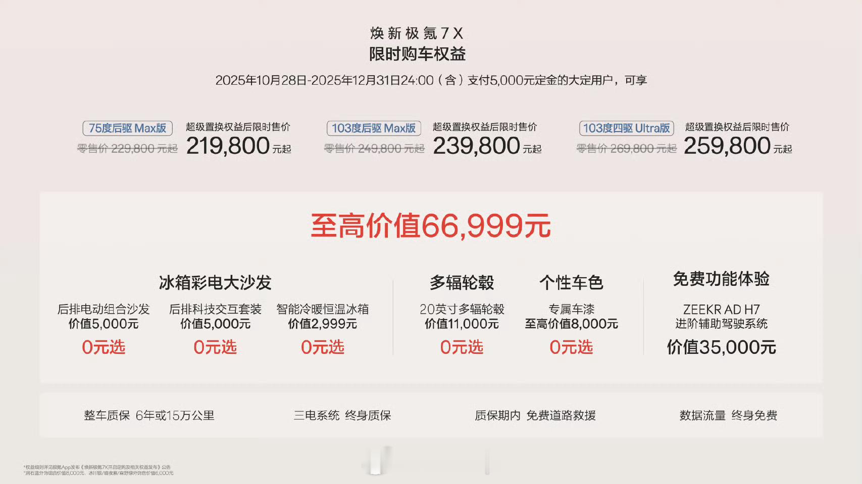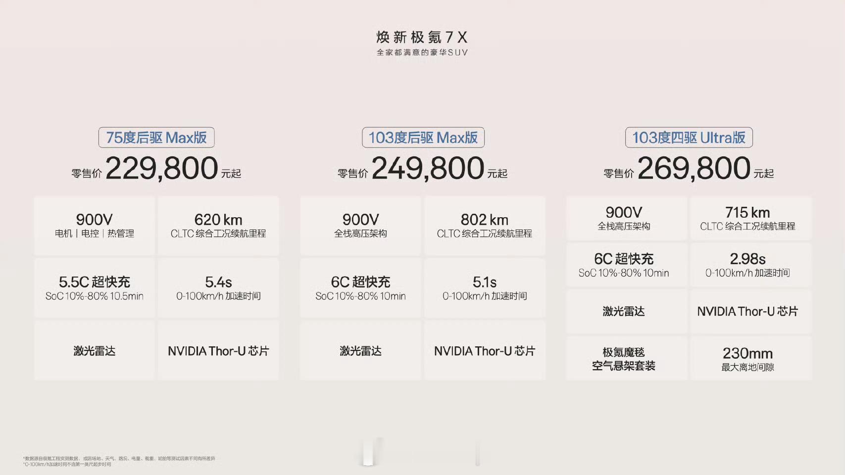 焕新极氪7X正式上市,75度后驱Max版 、103度后驱Max版、103度四驱Ultra版三款配置,官方零售价分别为229,800元、249,800元和269,800元!价格和之前一样但新车全方位进化,挺香啊
