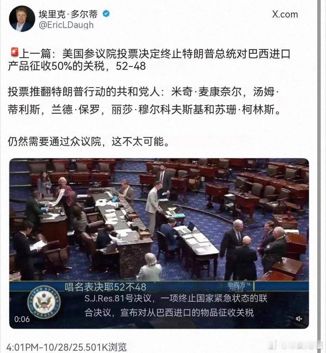 美国参议院以微小优势通过投票,取消美国对巴西的关税,其中也有共和党成员投了赞成票,证明现在反特朗普的势力不仅是民主党,共和党内部也有人不满特朗普