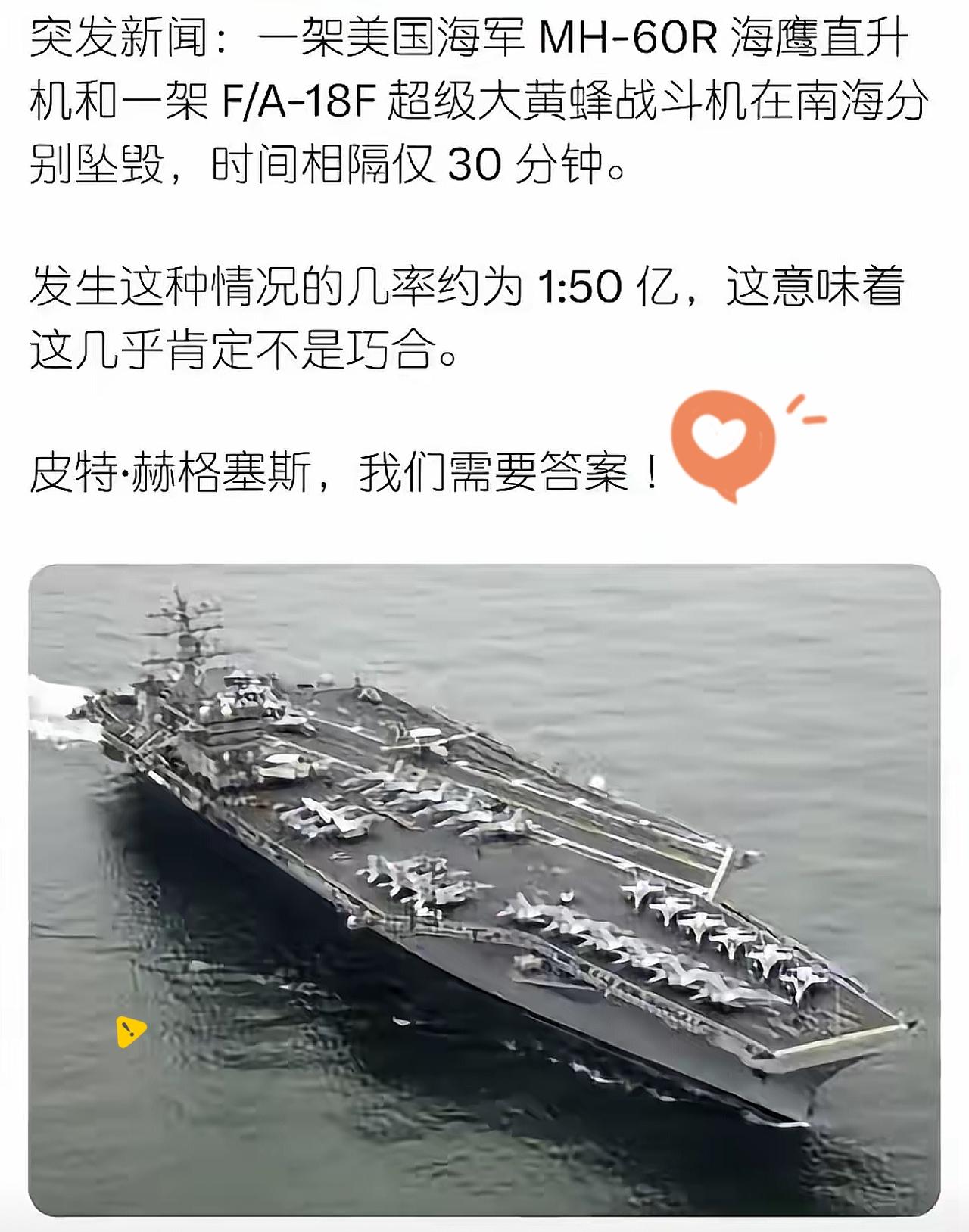 藏不住了!美军两架飞机坠机,美国开始媒体慌了,直接把矛头指向中国!两架飞机同时坠毁概率低于1:50亿,一定有是龙哥神秘武器! 前阵子美国“尼米兹”号航母在南海出了个事,半小时里接连有两架军机坠海,本来就是一起军事事故,结果好些美国媒体不琢磨自家问题,反而先把矛头指向了中国,还编出了挺离谱的说法。 他们说这两架飞机同时坠毁的概率低于五十亿分之一,肯定不是巧合,背后是中国有什么“神秘武器”在搞事情。 这话听着就像编故事,为了吸引眼球,硬是给中国安了个“完美敌人”的名头,可仔细想想,这更像是在掩盖他们自己的麻烦,哪儿是什么正经指控。 其实明眼人都能看出来,这种“神秘武器”的说法,根本就是为了转移注意力,不想让人盯着美军内部的问题。 这两年美军的航空事故越来越多,光2024年就发生了41起A级事故,比前一年翻了一倍。 之前“杜鲁门”号航母更夸张,5个月里摔了3架F-18,这么高的事故率,哪还需要什么“神秘武器”?所谓的“低概率巧合”,不过是他们自欺欺人罢了。 再看看出事故的“尼米兹”号,这艘航母都服役50年了,早就超出设计寿命10年,这次还是最后一次远洋部署,出问题本身就不算意外。 坠毁的那两架飞机也不省心,MH-60R直升机的核心设计还是上世纪70年代的,这五年事故就没断过;F/A-18F战斗机因为部署太频繁,超负荷工作,三年内事故率直接涨了300%。这些实打实的数据,比什么“神秘武器”的猜测靠谱多了。 机器不行,操作机器的人状态也不好。美军在南海天天搞高强度演练,官兵们早就身心俱疲,国内的政治纷争还影响到了军饷发放,士气能高吗? 舰载机起降本来就是“刀尖上跳舞”的高危活,稍微有点疏忽就可能出大事,哪用得着别人动手。 说到底,美国媒体这么炒“神秘武器”,还是因为中国越来越强,他们心里慌了。以前习惯了自己在军事上绝对领先,现在看到中国的歼-20、高超音速导弹这些装备不断进步,五角大楼就坐不住了。 在这种焦虑下,他们自己出点失误,就总觉得是中国用了什么非常规手段,这样想能让他们好受点,觉得“不是我们不行,是对手在作弊”。 而且这么说还有个好处,既能安抚国内民众对军队实力的担心,又能找理由要更多军费,继续保持跟中国对抗的姿态。之前美军舰船碰撞事故时,也有过类似的论调,可见这就是他们遇到问题时的惯用套路。 不过,最打脸的是美国太平洋舰队自己,事故发生第二天就发声明,明确说排除第三方干扰的可能,等于官方直接否定了媒体的胡编乱造。 从技术上来说也说不通,要是真有能一下子弄掉两架军机的武器,肯定会在美军的侦测网络里留下痕迹,可他们压根没提这茬,这种沉默本身就是最好的证明。 美国媒体炒出来的“神秘武器”,说到底就是个幌子,真正该关注的是美军自己的问题——老掉牙的装备、疲惫的官兵、混乱的管理。他们与其花心思给中国扣帽子,不如好好检查自家的军事体系,看看那些真实存在的漏洞。