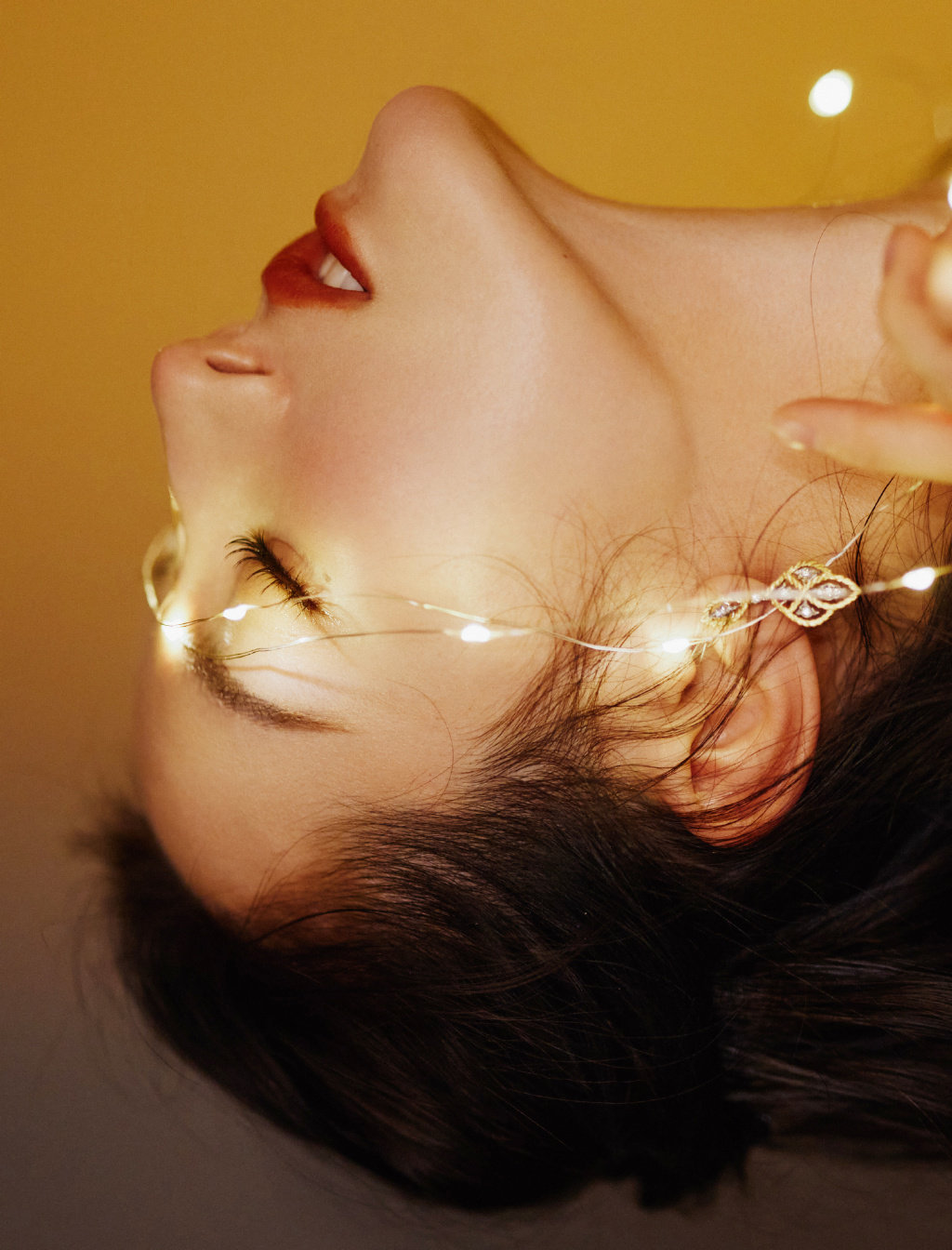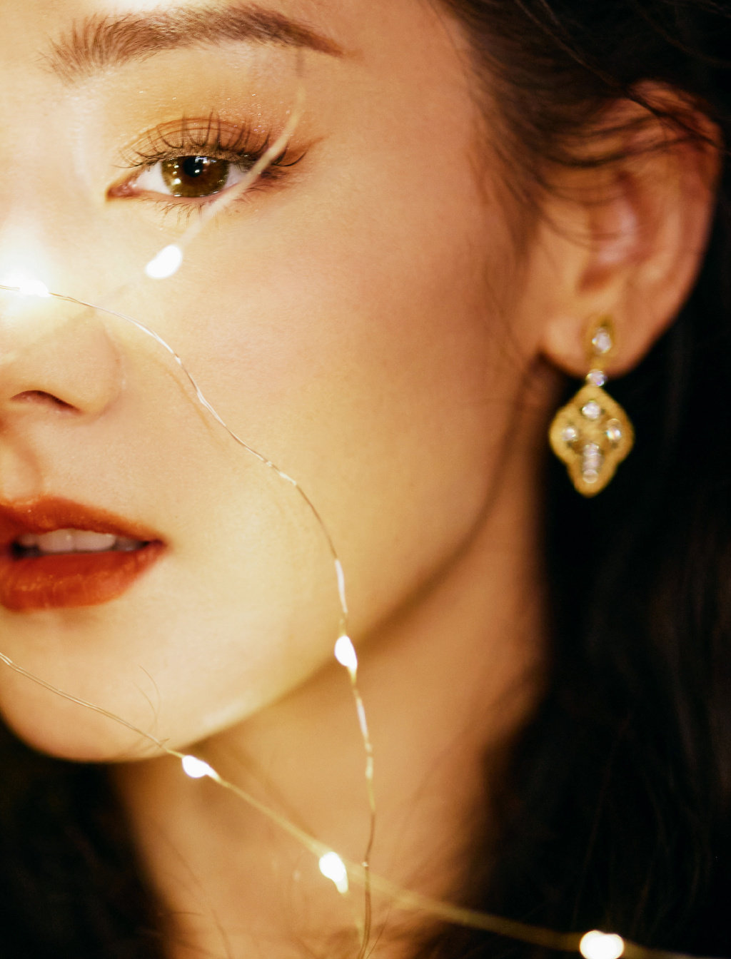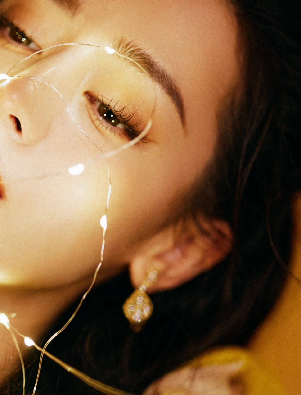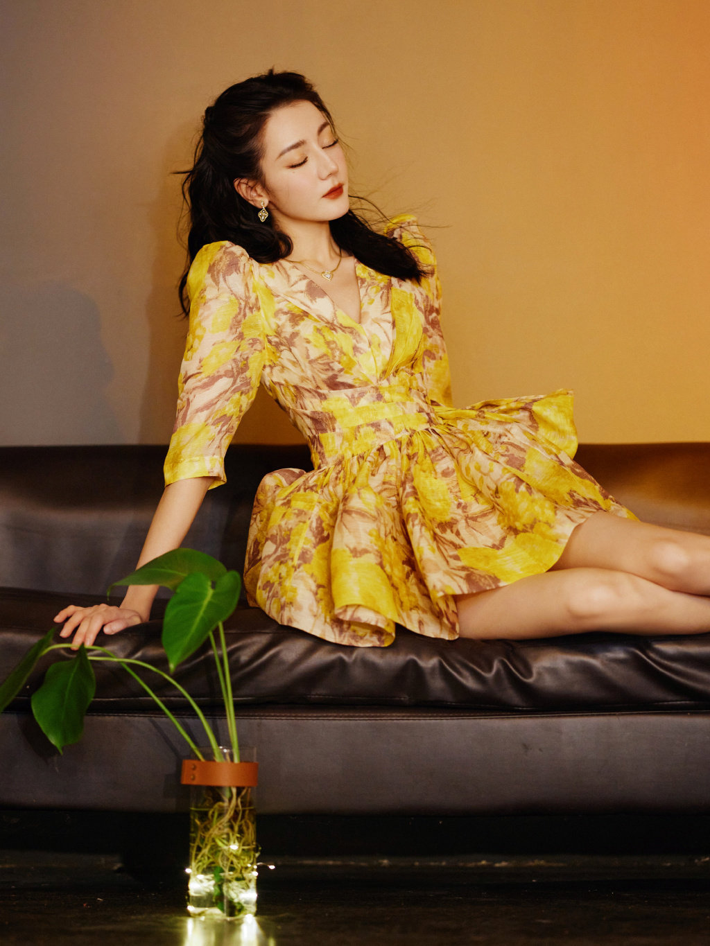 迪丽热巴:明黄碎花裙,美腿写真组图