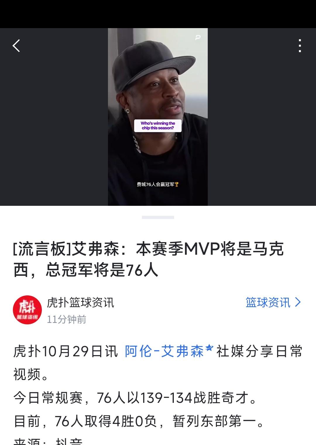 费城76人今天又赢球啦,四胜0负东部第一,艾弗森都敢预测76人是总冠军! 常规赛MVP是马克西,最佳新秀埃奇库姆。 恩比德倒是不太行了,不影响球队强大。 我认为76人最多东部冠军,总冠军不敢想呀。[大笑]