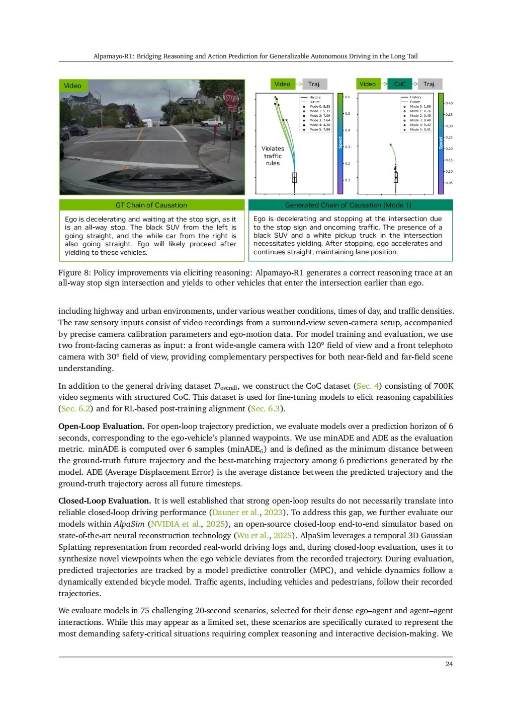 * 闭环: 在 AlpaSim 仿真中,AR1 使偏离道路率降低了 35%,近距离接触率降低了 25%。